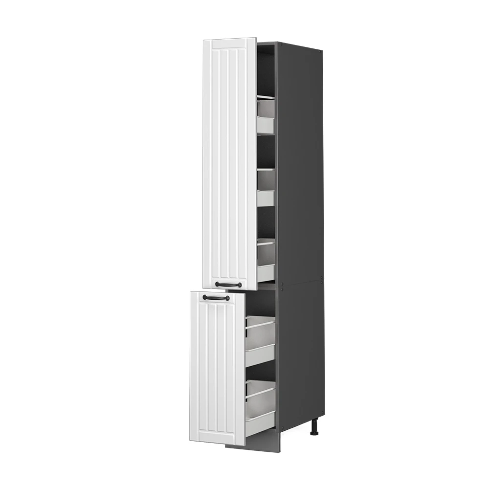- MAßE: Der Küchenschrank hoch hat folgende Abmessungen: Breite: 30 cm, Höhe: 206,8 cm, Tiefe: 58 cm. Alle detaillierten Größen sind auf den Fotos angegeben.