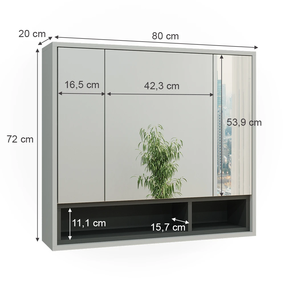 - MAßE: Der Badezimmerschrank mit Spiegel hat folgende Abmessungen: Breite: 80 cm, Höhe: 72 cm, Tiefe: 20 cm. Alle detaillierten Größen sind auf den Fotos angegeben.