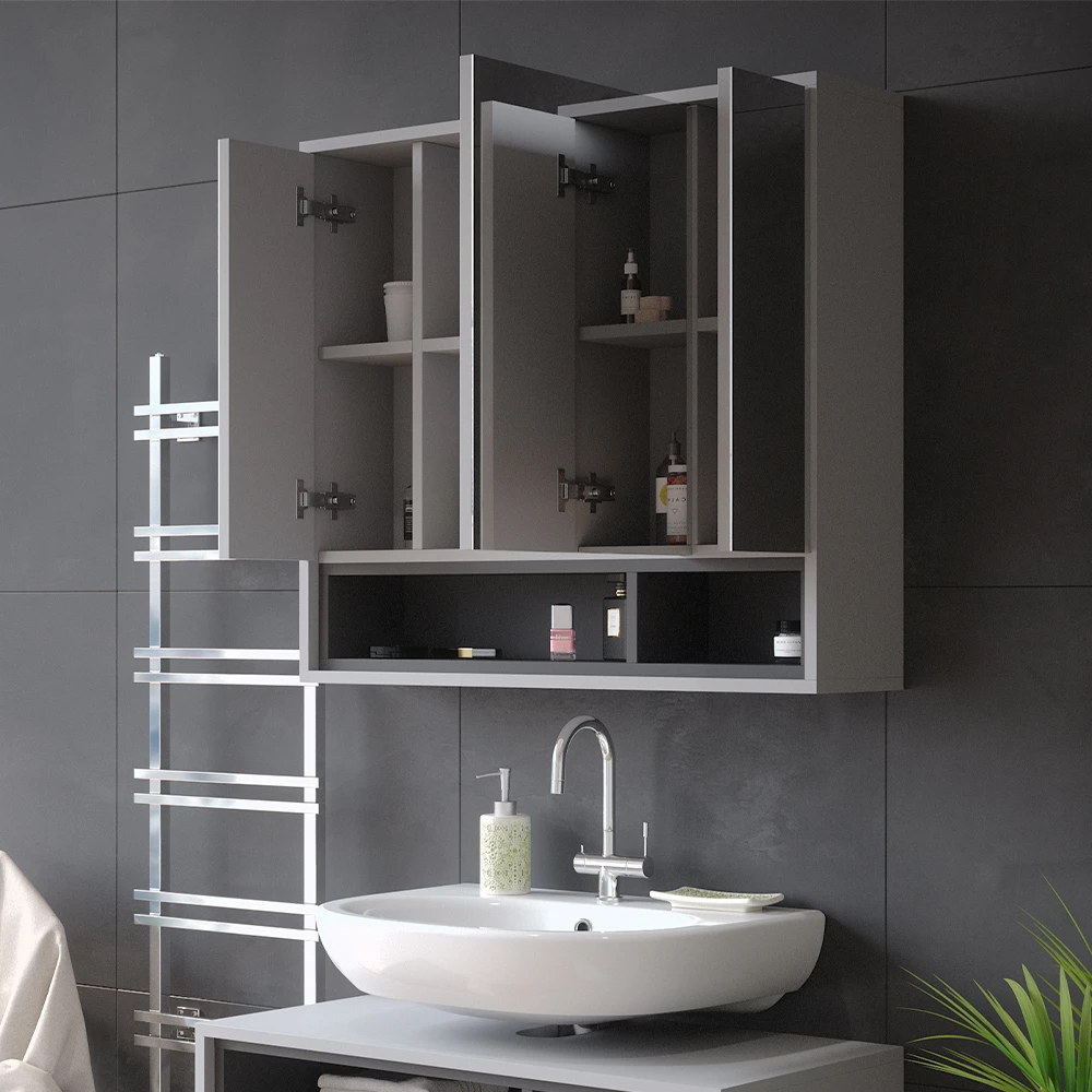 - Dieser Badezimmer-Spiegelschrank verfügt über drei Spiegeltüren und offene Regale mit reichlich Stauraum. Er ist ideal für das Aufbewahren von Badutensilien und Kosmetika.