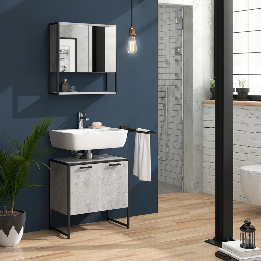 - Das Badezimmerschrank-Set bietet durch seinen Metallrahmen und viel Stauraum eine flexible Gestaltungsmöglichkeit für das Bad.