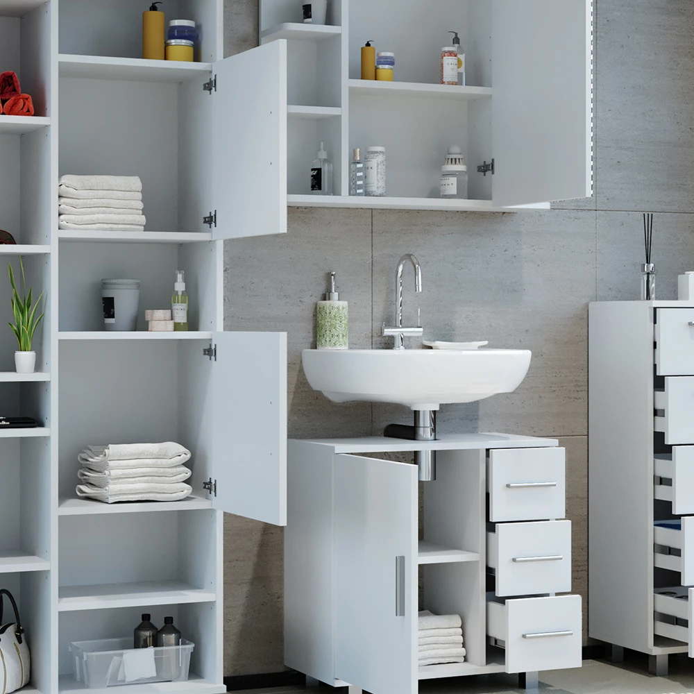 - LIEFERUMFANG: Bad Spiegelschrank, Waschbeckenunterschrank, 2x Badschrank, Montageanleitung, Montagematerial