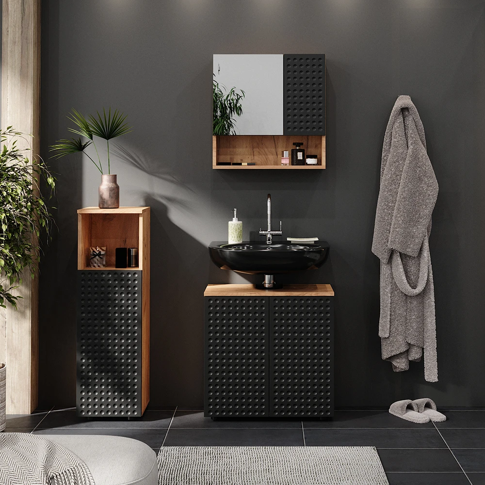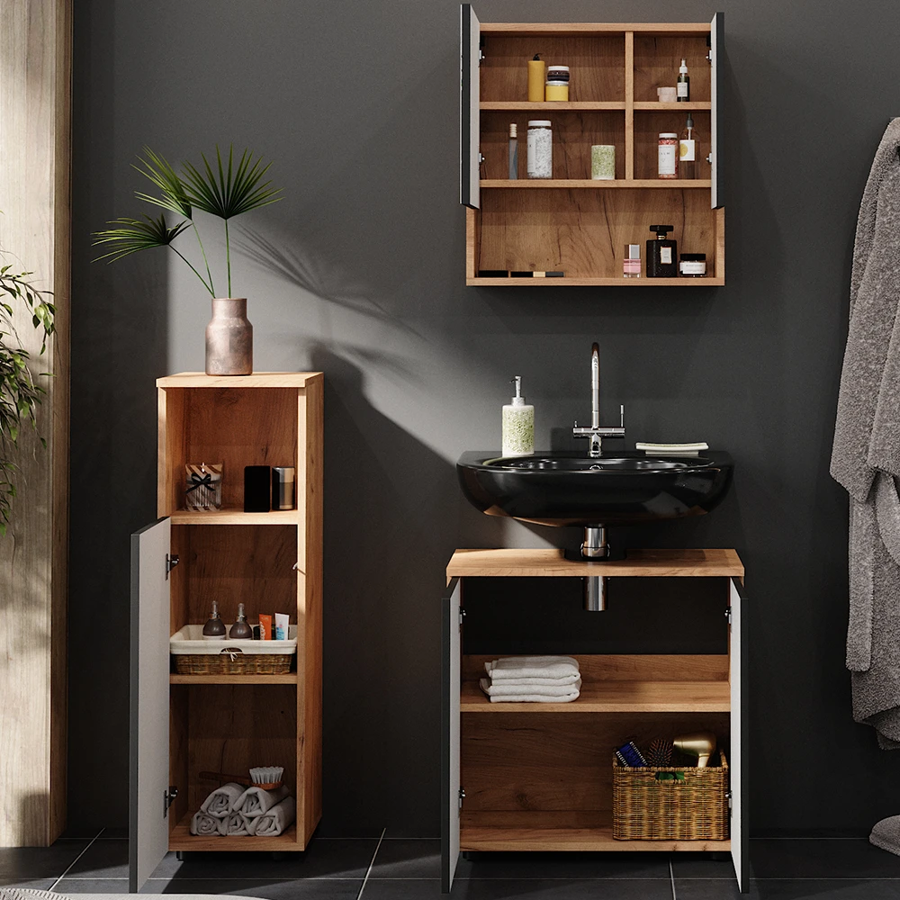 Das 3-teilige Irma-Badmöbel-Set ist die perfekte Lösung für alle, die ein stilvolles und praktisches Badezimmer suchen. Das Set besteht aus einem Waschbeckenunterschrank, einem Spiegelschrank und einem Midischrank und bietet somit reichlich Stauraum für alle Ihre Badutensilien. Das innovative Design der Möbel fügt sich mühelos in jedes Badezimmer ein und die Füße sorgen für eine erhöhte Stabilität. Ein weiterer Pluspunkt: Sie können verschiedene Artikel der Serie kombinieren und so ein individuelles Ensemble für Ihr Badezimmer kreieren. Ergänzen Sie dieses Set mit zusätzlichen Produkten aus der Sammlung Irma und machen Sie Ihr Bad zu einem Ort der Entspannung und Erholung und erleben Sie ein einzigartiges Badezimmererlebnis!