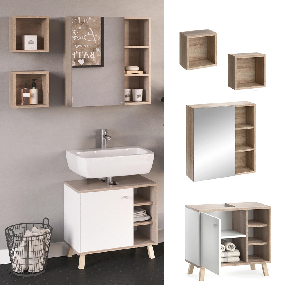 - MATERIAL: Das Set mit dem Spiegelschrank besteht aus pflegeleichter Spanplatte 16 mm, mit einer Melaminharzbeschichtung.