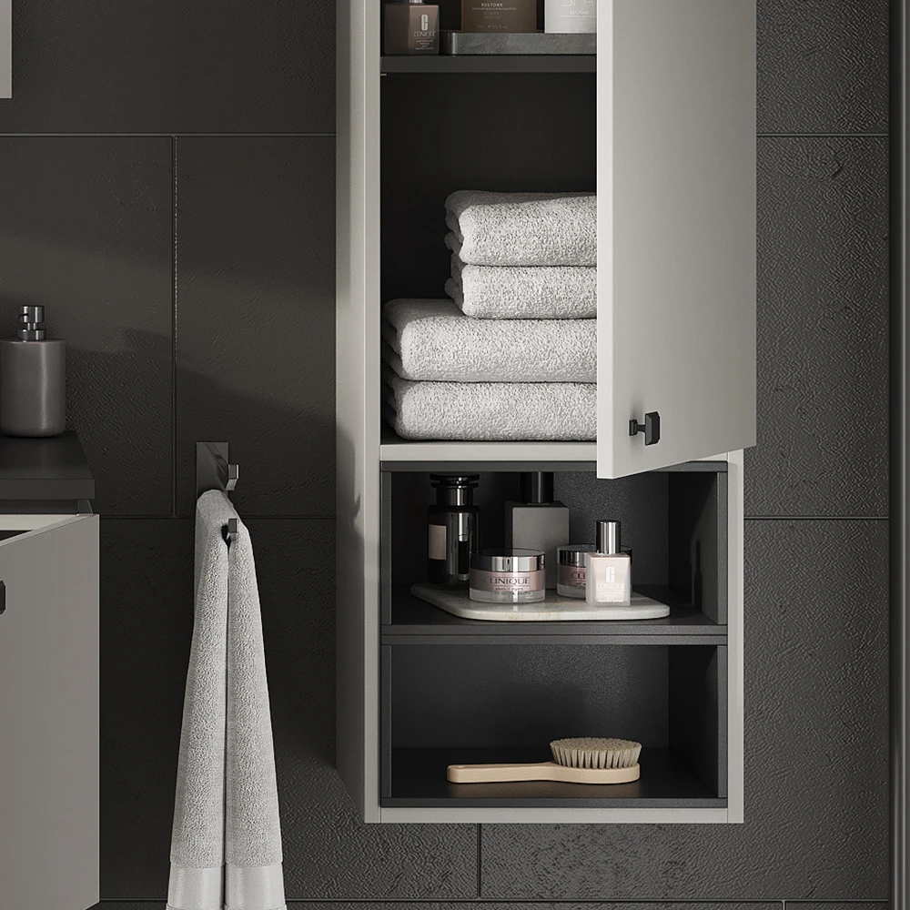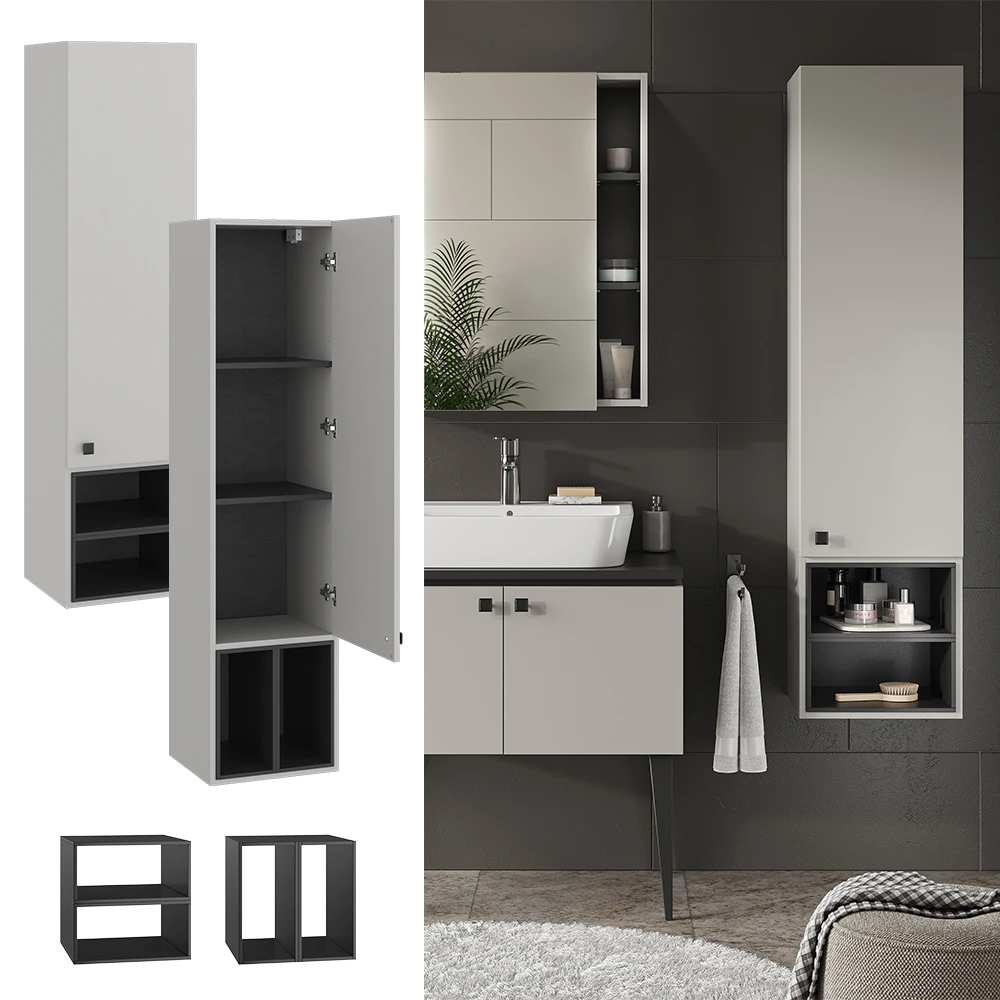 - Ein moderner und eleganter Badezimmerhochschrank mit schlichtem, aber ansprechendem Design und einer hohen Menge an Stauraum.