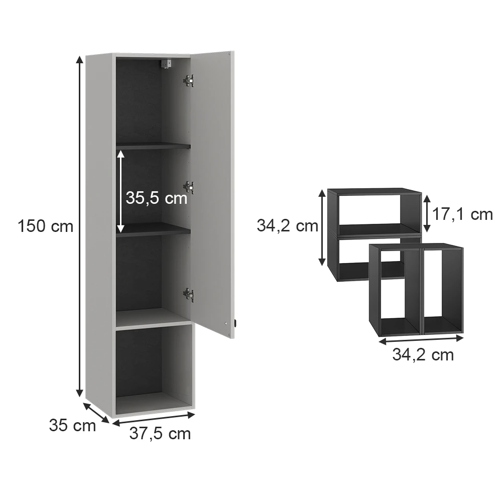 - MAßE: Der Wäscheschrank hat folgende Abmessungen: Breite: 37,5 cm, Höhe: 150 cm, Tiefe: 35 cm. Alle detaillierten Größen sind auf den Fotos angegeben.