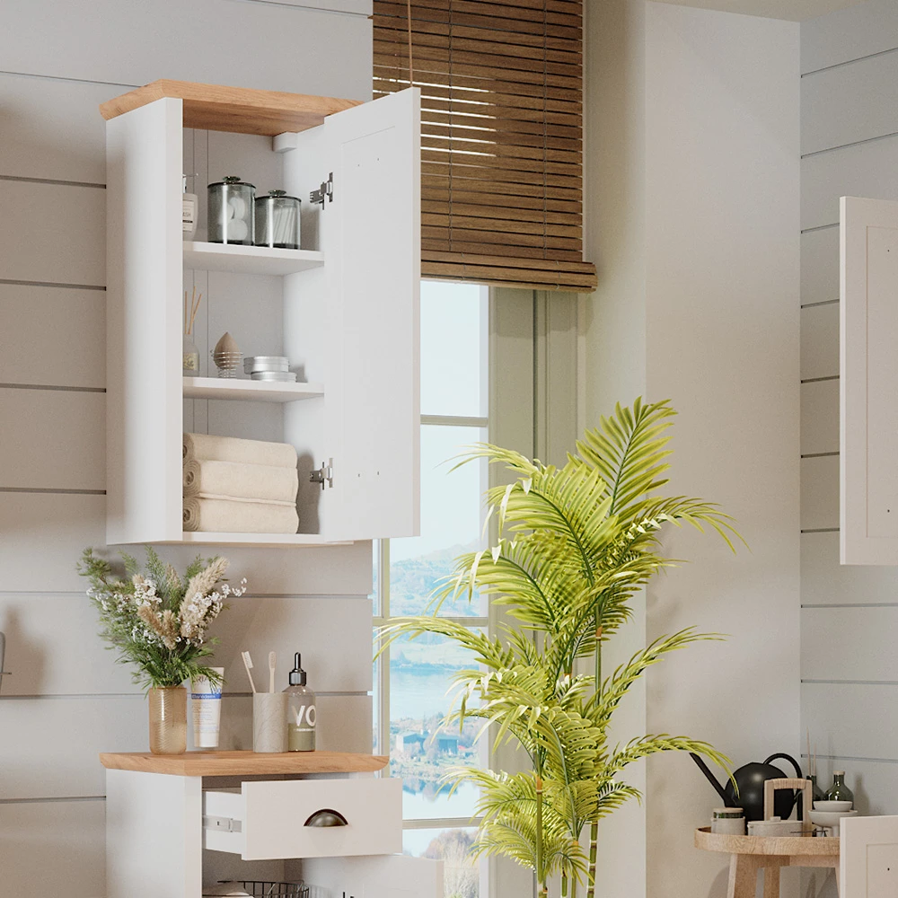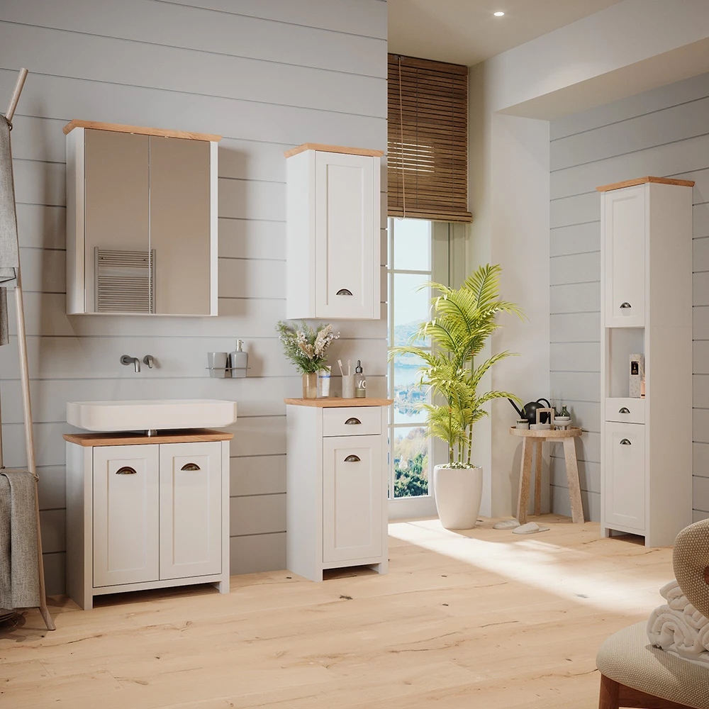 Der Nino Badschrank ist das perfekte Möbelstück für Ihr Badezimmer. Er präsentiert sich im klassischen Stil und ist mit eleganten Design-Metallgriffen verziert, die ihm ein besonderes Aussehen verleihen. Dieser Badezimmerschrank hängend bietet Ihnen reichlich Stauraum und kann einfach an der Wand aufgehängt werden. Sie werden von der hohen Verarbeitungsqualität und dem außergewöhnlichen Design begeistert sein. Der Nino Bad Hängeschrank ist mit anderen Artikeln der Nino Collection kompatibel, sodass Sie Ihr Badezimmer zu einem einheitlichen und stimmigen Raum gestalten können. Holen Sie sich mit dem Nino Badschrank ein außergewöhnliches Möbelstück in Ihr Bad, das schön aussieht und zugleich funktionell ist. Investieren Sie in Qualität und schaffen Sie sich Ihren eigenen kleinen Wellnessbereich.