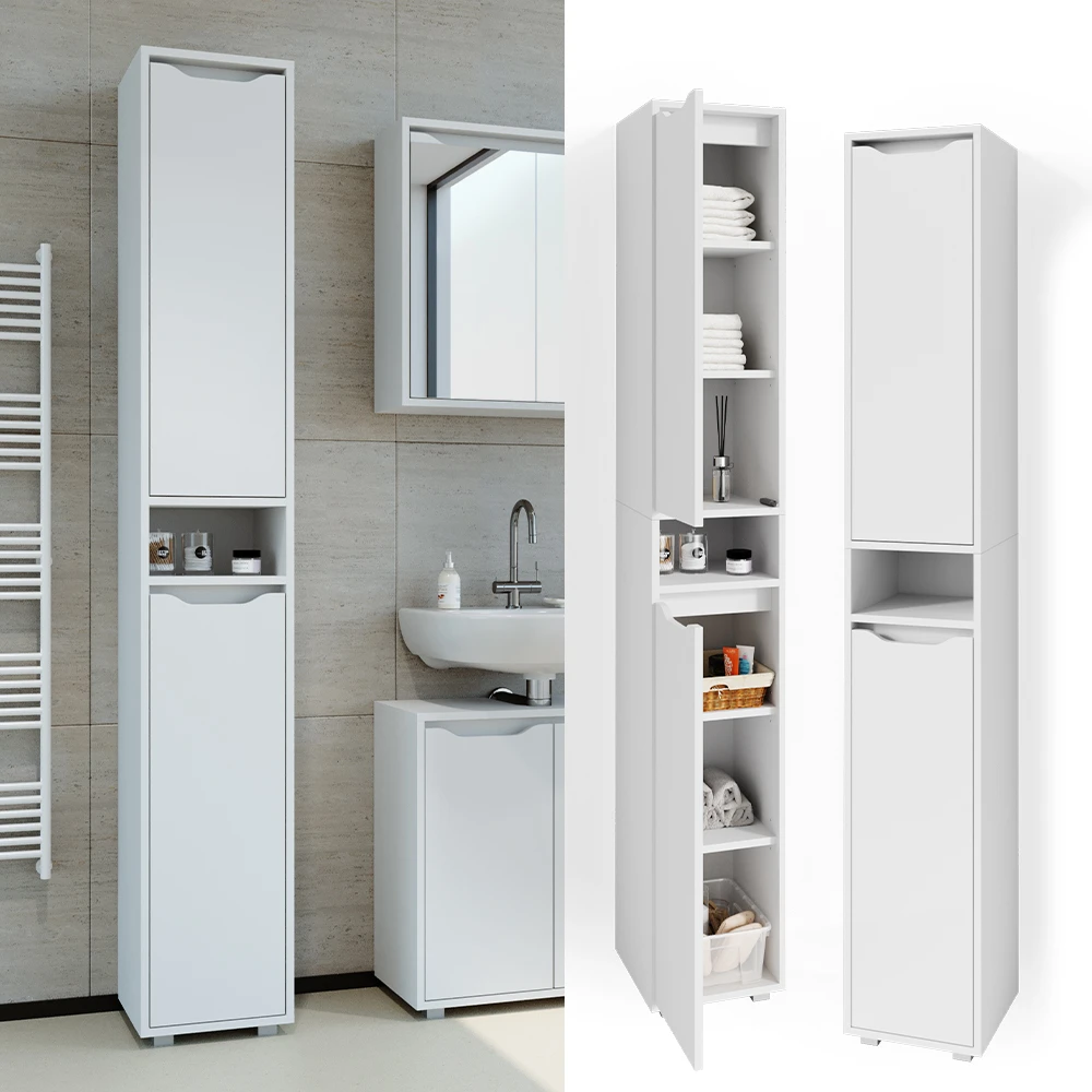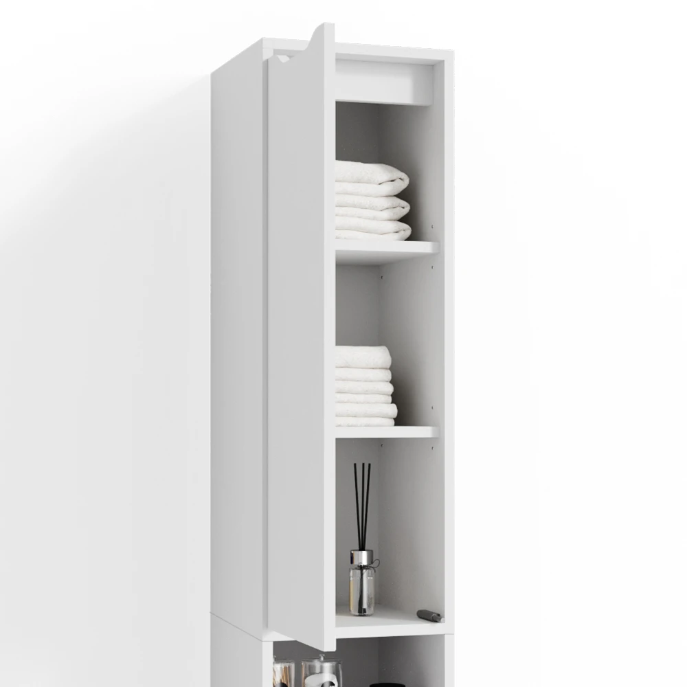 Der Badschrank Ruben ist das perfekte Möbelstück für Ihr Badezimmer! Sein minimalistisches Design fügt sich perfekt in jede moderne Einrichtung ein und bietet viel Platz, um Ihre Accessoires und Pflegeprodukte zu verstauen. Mit einem offenen Fach und zwei Türen verfügt dieser Hochschrank über insgesamt sieben Einlegeböden – genug Platz, um Ihre Handtücher und Bademäntel übersichtlich zu ordnen. Das grifflose Fassadendesign verleiht dem Schrank einen eleganten Look. Ruben ist auch kompatibel mit anderen Produkten aus der Ruben Collection, um eine perfekte Badgestaltung zu schaffen.