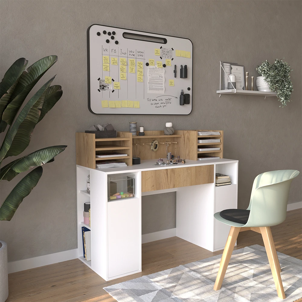 Schaffen Sie Ordnung und finden Sie alles schnell. Offene Regale bieten leichten Zugriff – ein effizienter Arbeitsplatz im Arbeitszimmer. Verwandeln Sie Räume in kreative Oasen. Ob Arbeit, Studium, Basteln oder Gestalten – dieser Tisch passt sich an und inspiriert. Die sorgfältig ausgewählten Materialien und die durchdachte Konstruktion garantieren Langlebigkeit und Belastbarkeit. Die Oberflächen dieses Tisches sind so gestaltet, dass sie sich mühelos reinigen lassen. Ein feuchtes Tuch genügt, um Verschmutzungen zu entfernen.
