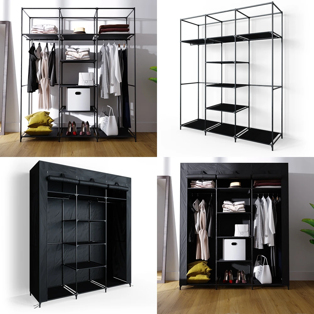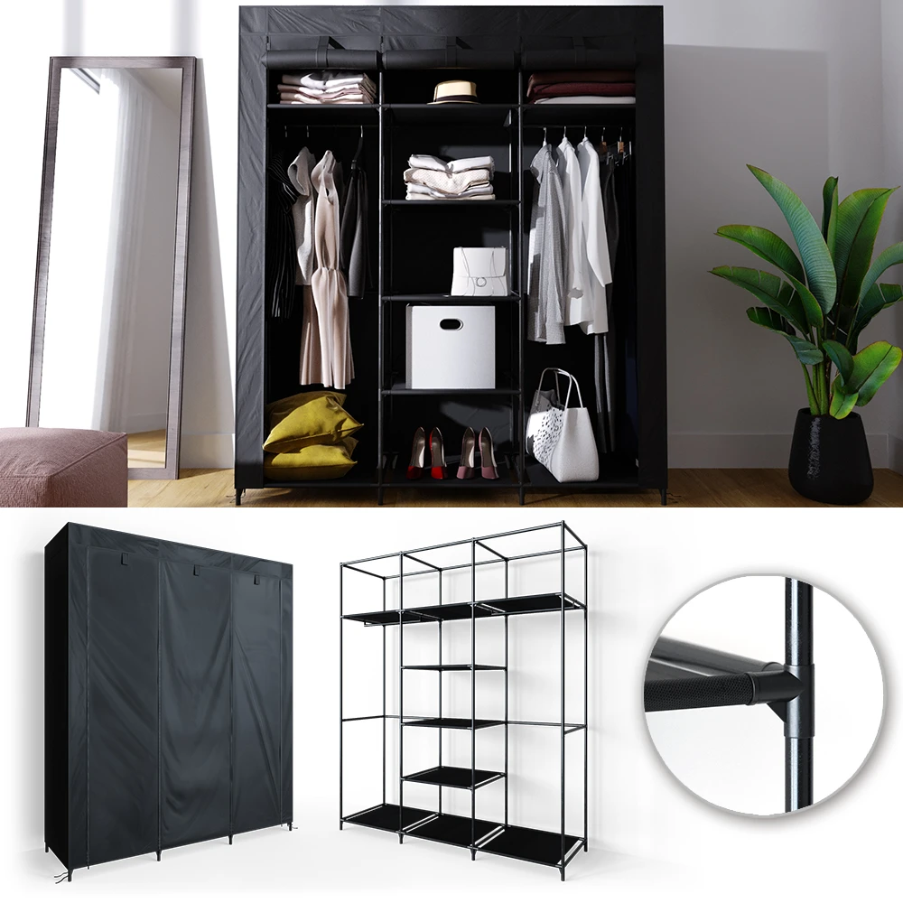 Der Kleiderschrank besteht aus einem stabilen Gestell aus Stahlrohr und robustem Vlies-Gewebe.