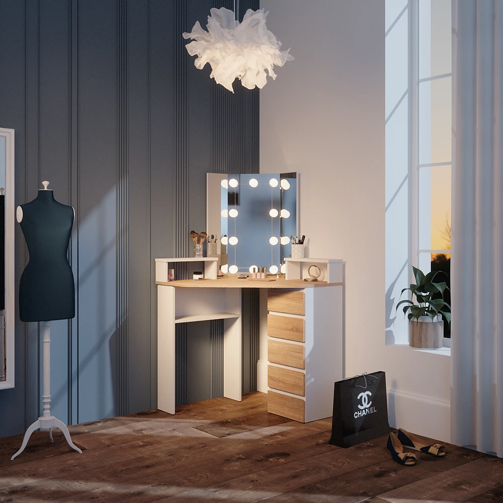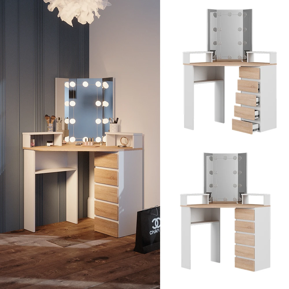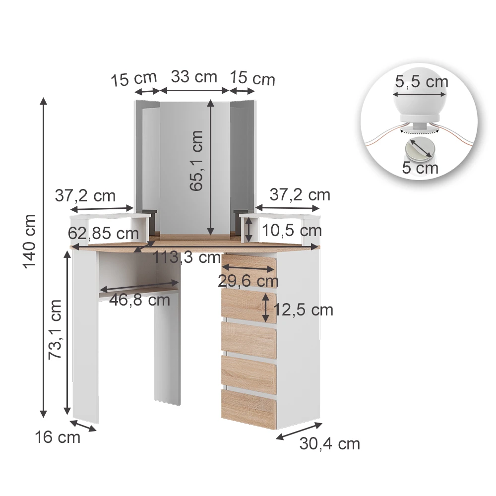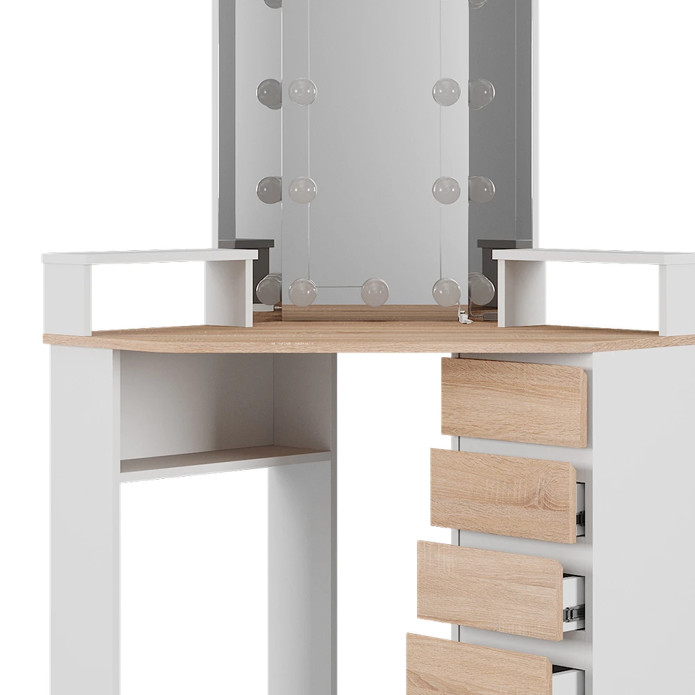 Eckschminktisch „Tilda“ Weiß/Sonoma/Sonoma 113.3 Cm Mit LED Beleuchtung Vicco