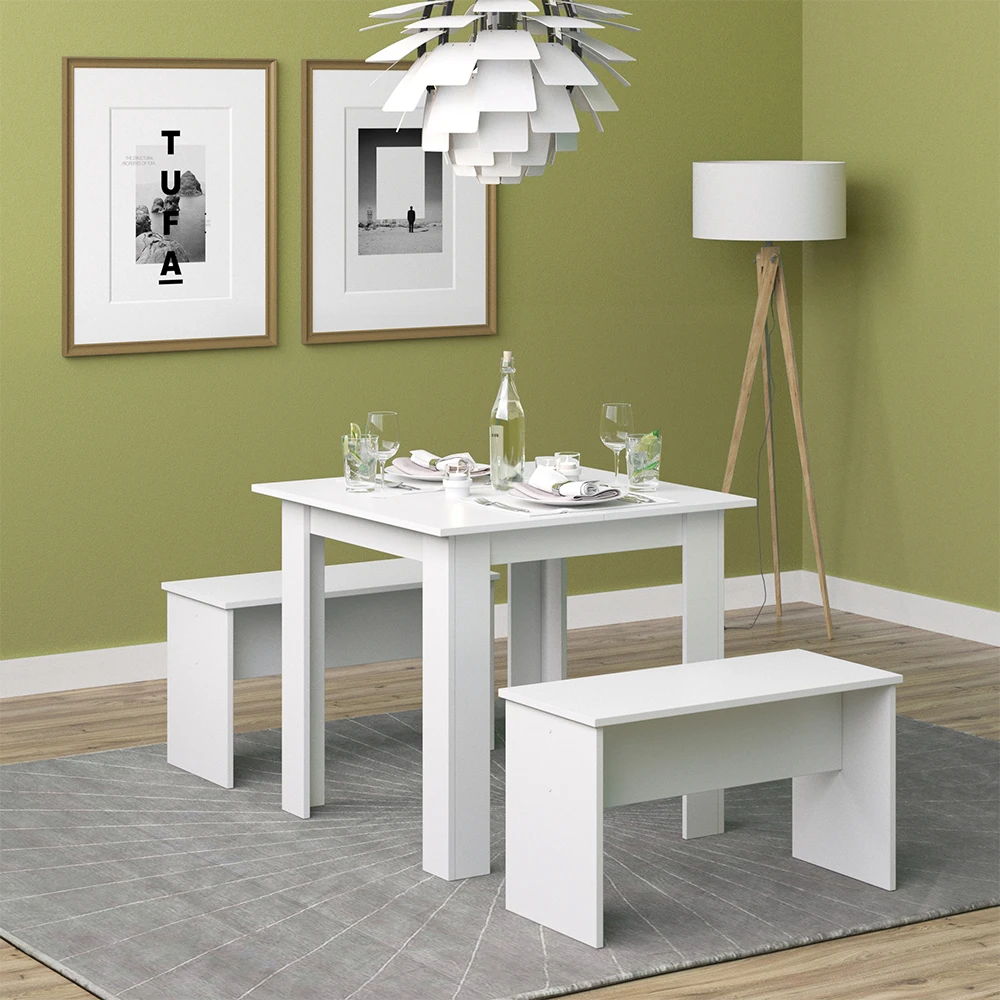 - MAßE: Der Küchentisch hat eine Breite von 80 cm, eine Höhe von 73 cm und eine Länge von 80 cm. Die detaillierte Größe anderer Teilen der Essgruppe sind auf den Fotos angegeben.