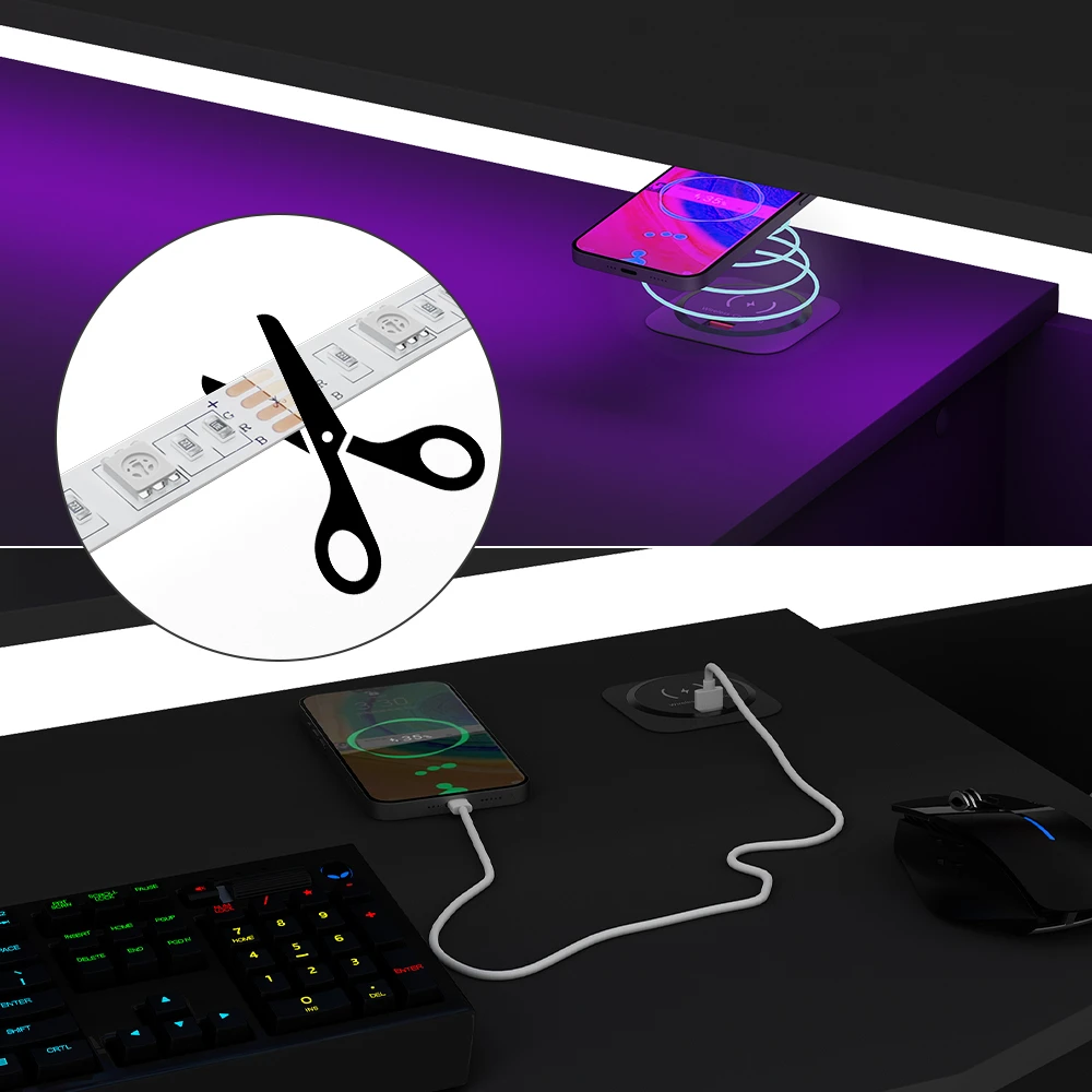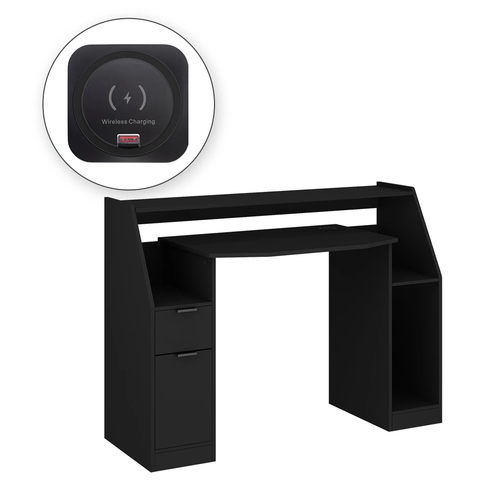 - Der Computertisch verfügt über eine integrierte QI-Ladestation und eine stimmungsvolle LED-Beleuchtung. Außerdem bietet er ausreichend Stauraum für Bürobedarf und andere Gegenstände.