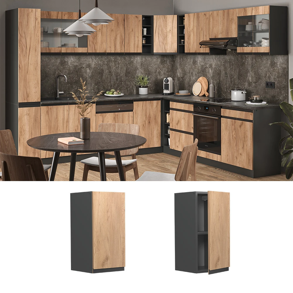 - Der hängender Küchenschrank mit geschlossenem Regal bietet Stauraum und verbirgt Geschirr und Zubehör vor neugierigen Blicken.