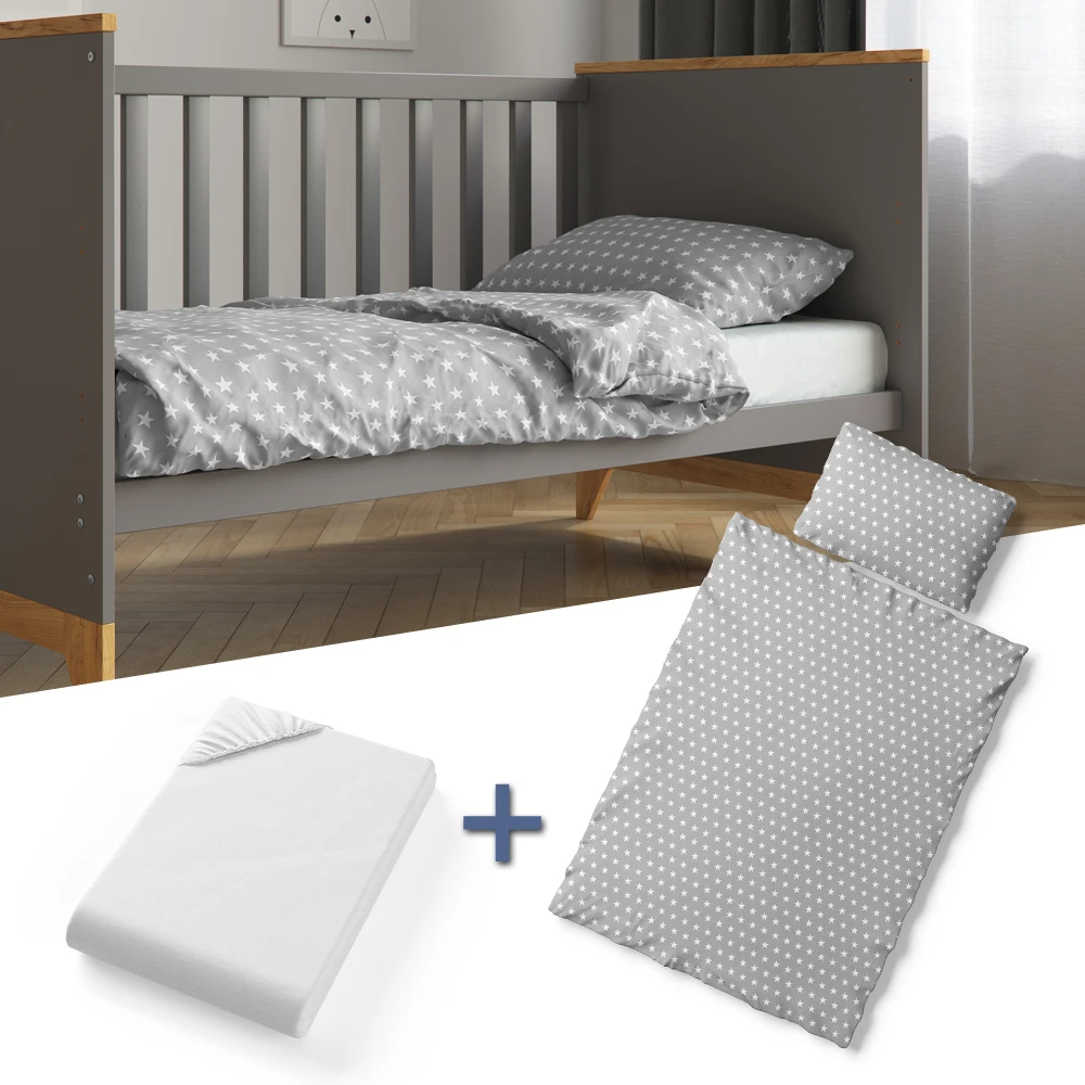Das Set besteht aus einem Laken mit Kissenbezug und einem Bettbezug.