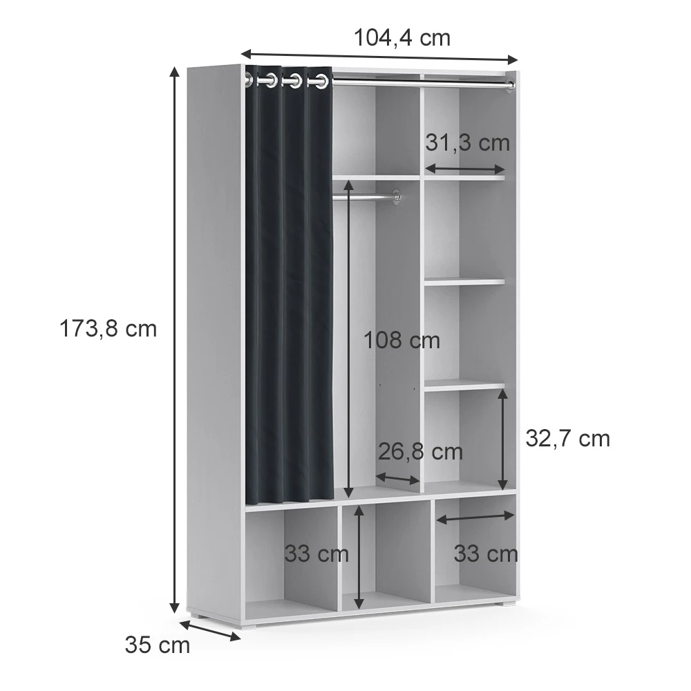 - MAßE: Das Kleiderschrank für Kinder hat eine Breite von 104,4 cm, eine Höhe von 173,8 cm und eine Tiefe von 35 cm. Alle detaillierten Größen sind auf den Fotos angegeben.