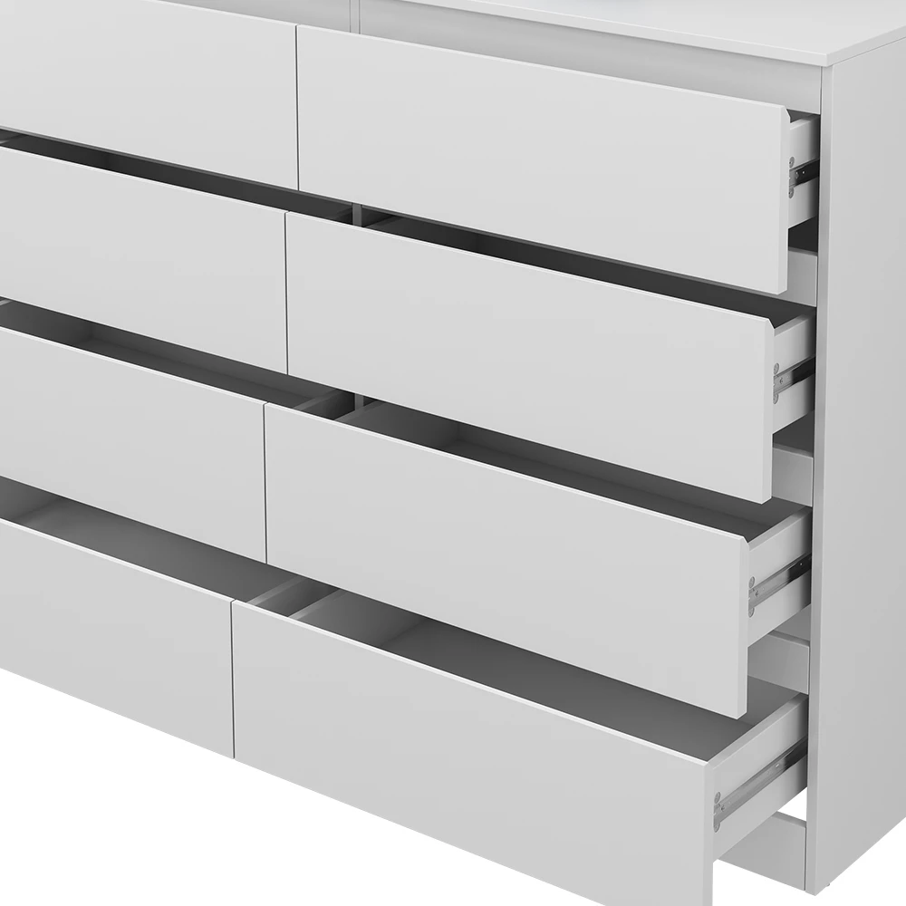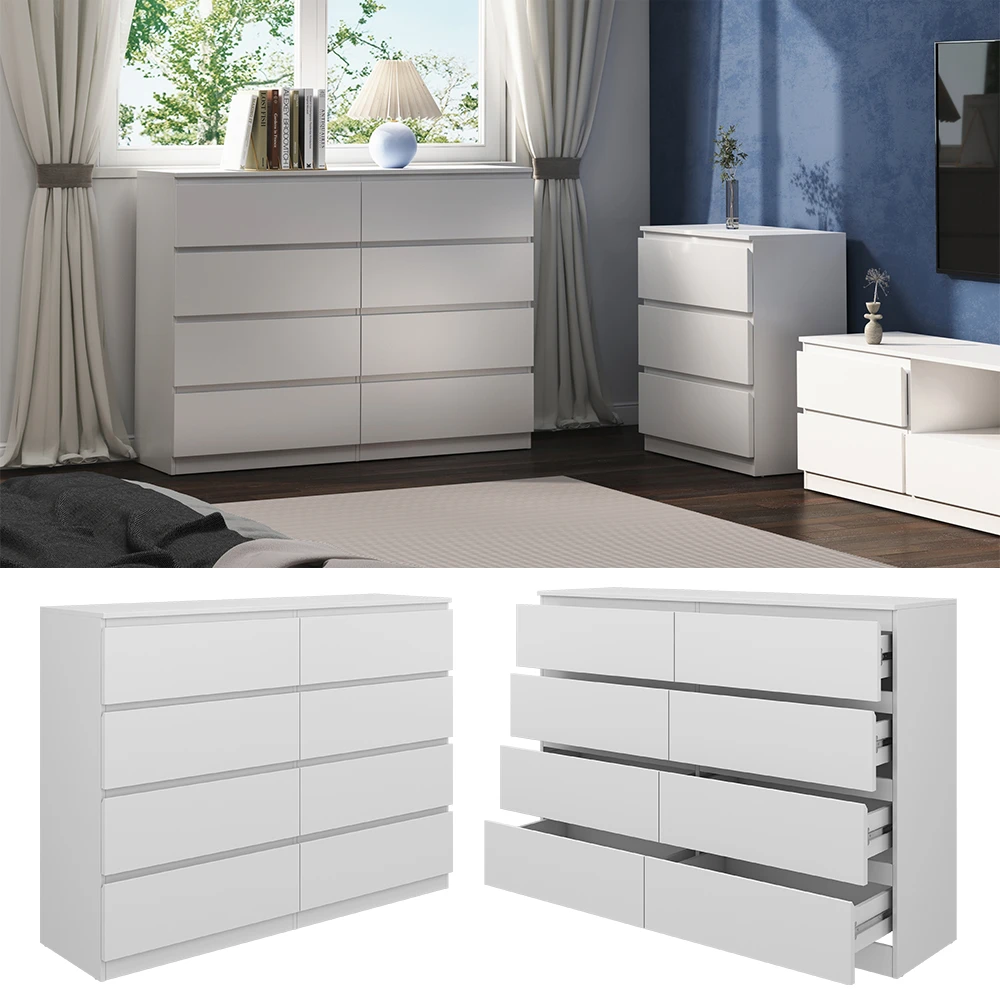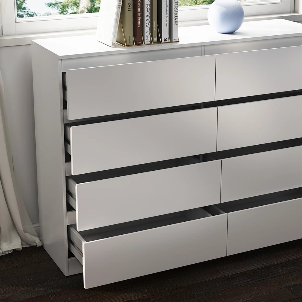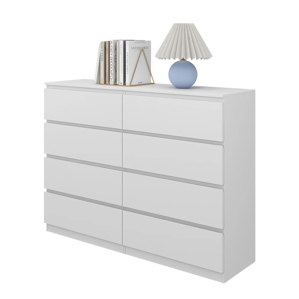 Diese Kommode besticht durch zeitlose Eleganz, die Ihr Zuhause verschönert und sich nahtlos in jedes Ambiente einfügt. Mit insgesamt 8 Schubladen bietet diese Kommode ausreichend Platz, um Ihre persönlichen Gegenstände zu verstauen und somit für Ordnung zu sorgen. Die Oberfläche dieses Möbelstücks ist äußerst pflegeleicht und behält trotz täglicher Nutzung ihre Schönheit. Ein einfaches Abwischen genügt. Die unkomplizierte Montage ermöglicht es Ihnen, den Kommodenschrank schnell und stressfrei in Ihrem Zuhause aufzustellen.