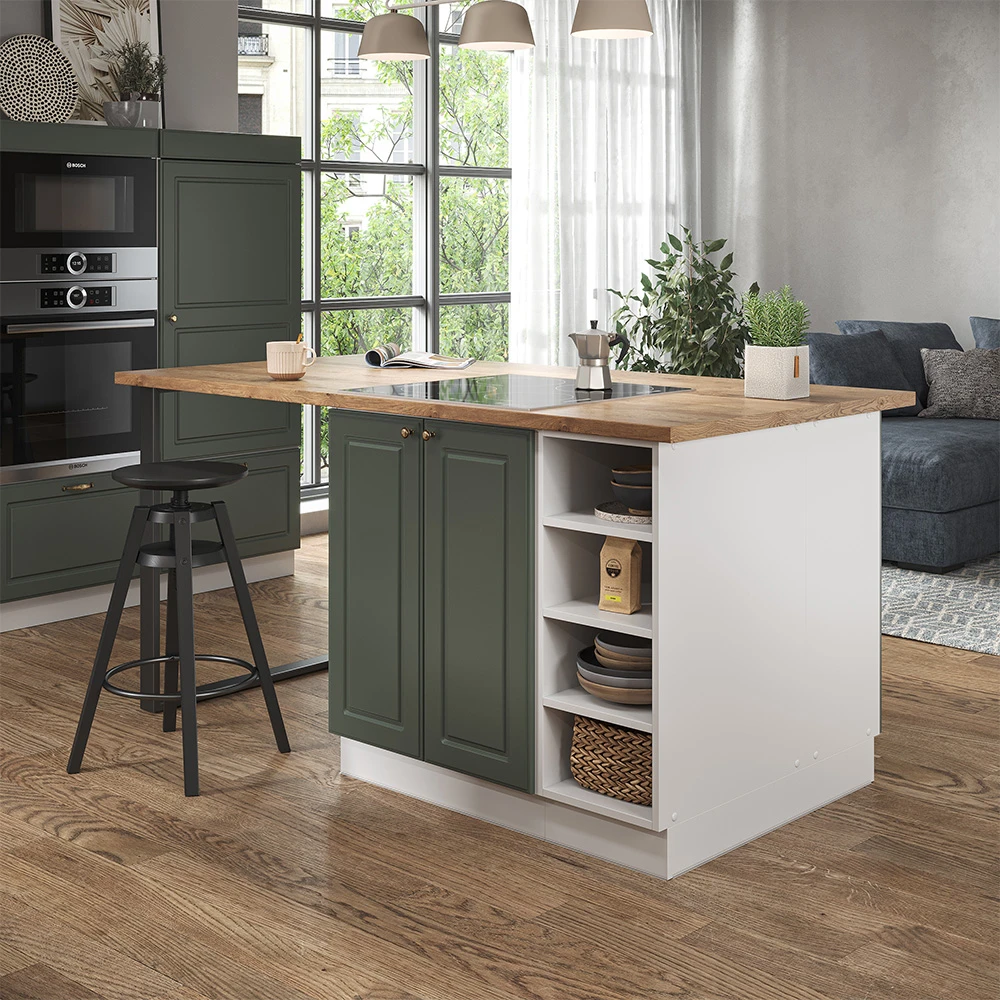 LIEFERUMFANG: Kücheninsel (Sofern nicht anders angegeben, gehören die Arbeitsplatten, Elektrogeräte und Dekoration nicht zum Lieferumfang), Montageanleitung, Montagematerial