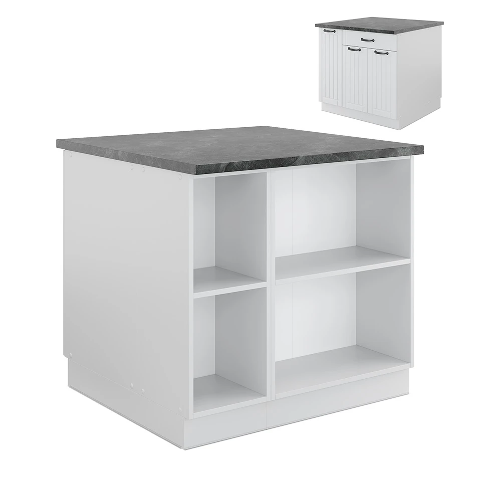 LIEFERUMFANG: Kücheninsel (Sofern nicht anders angegeben, gehören die Arbeitsplatten, Elektrogeräte und Dekoration nicht zum Lieferumfang), Montageanleitung, Montagematerial