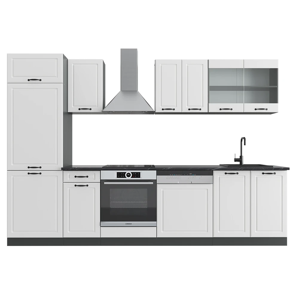 - MAßE: Das Küchenmöbel hat eine Breite von 300 cm, eine Höhe von 207 cm und eine Tiefe von 46 cm. Alle detaillierten Größen sind auf den Fotos angegeben.