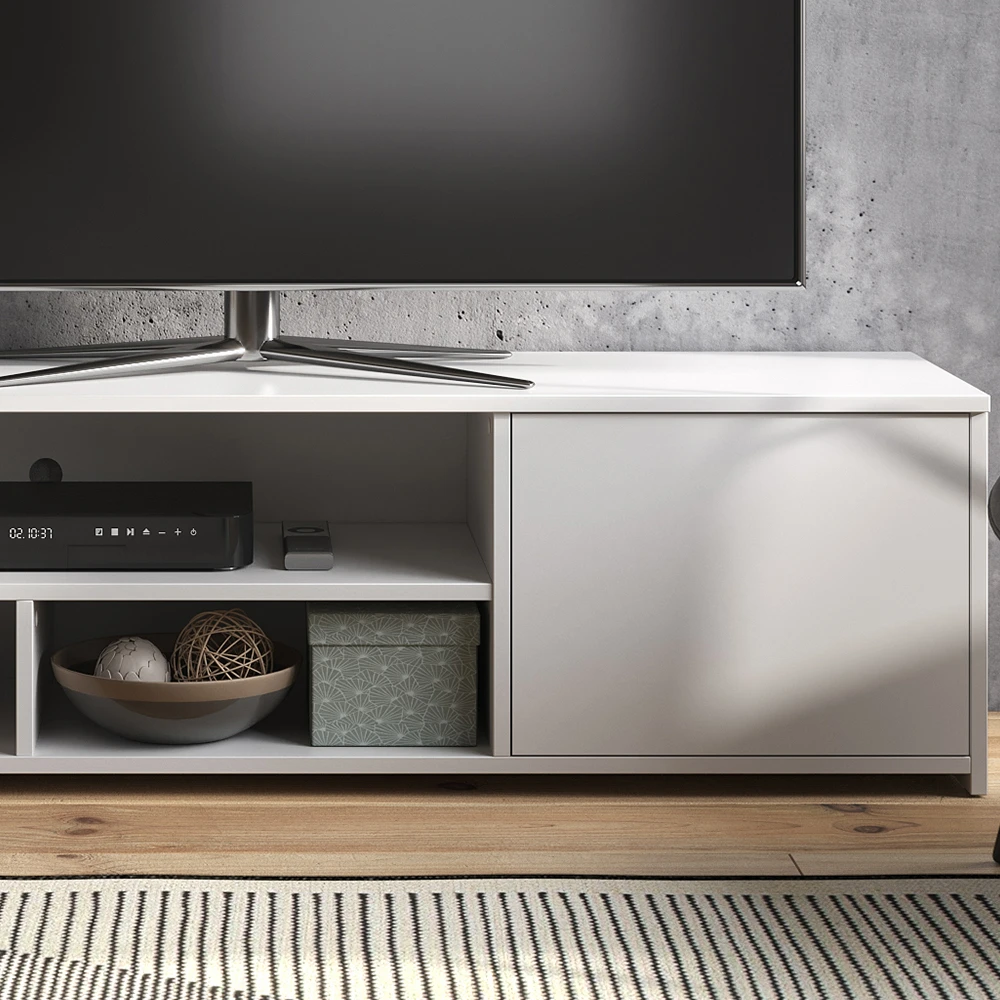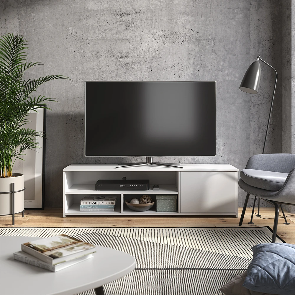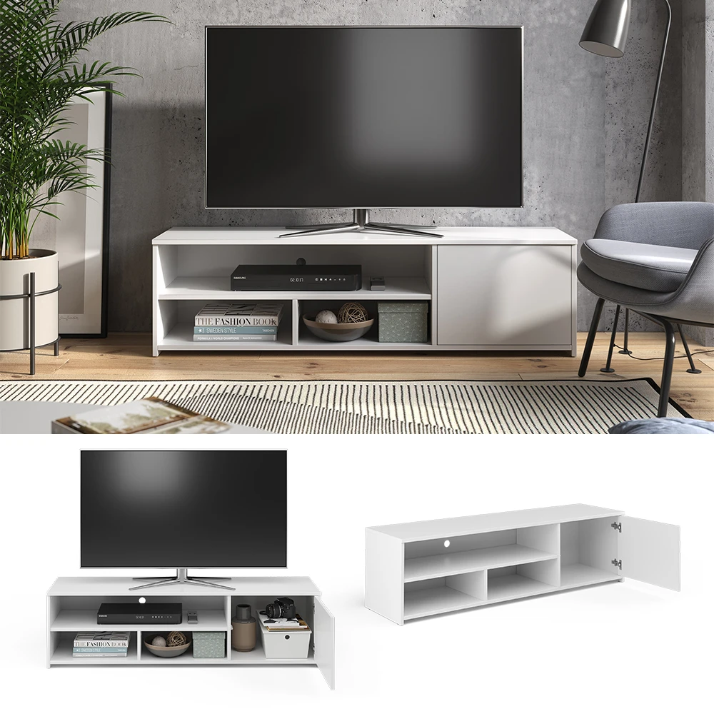 - Der Fernsehtisch bietet 3 offene Fächer und 1 Tür, um viel Stauraum für alle Ihre Multimedia-Geräte zu bieten.