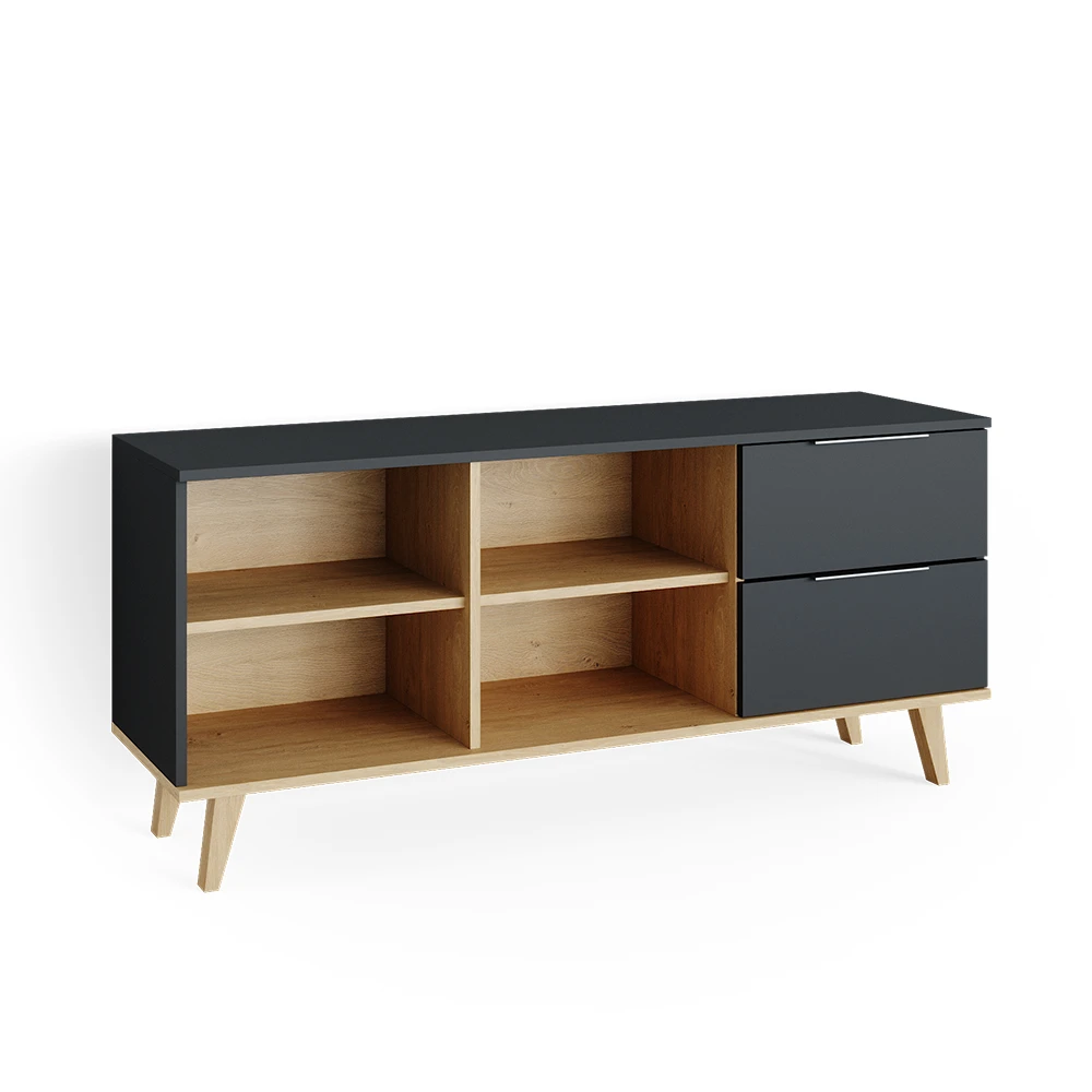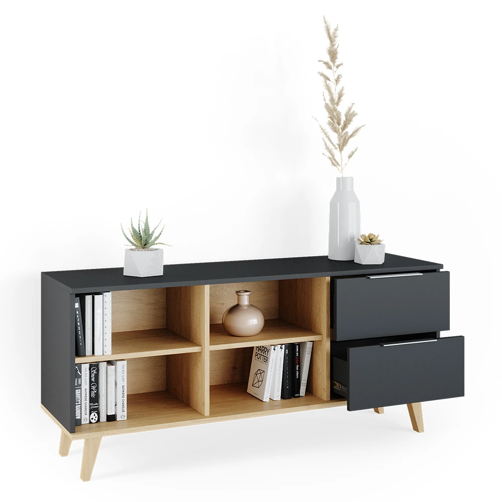 - Der Fernsehtisch Neptun bietet mit 2 Schubladen und offenen Regalen ausreichend Stauraum für TV-Zubehör und verfügt über elegante Füße für einen stilvollen Look.