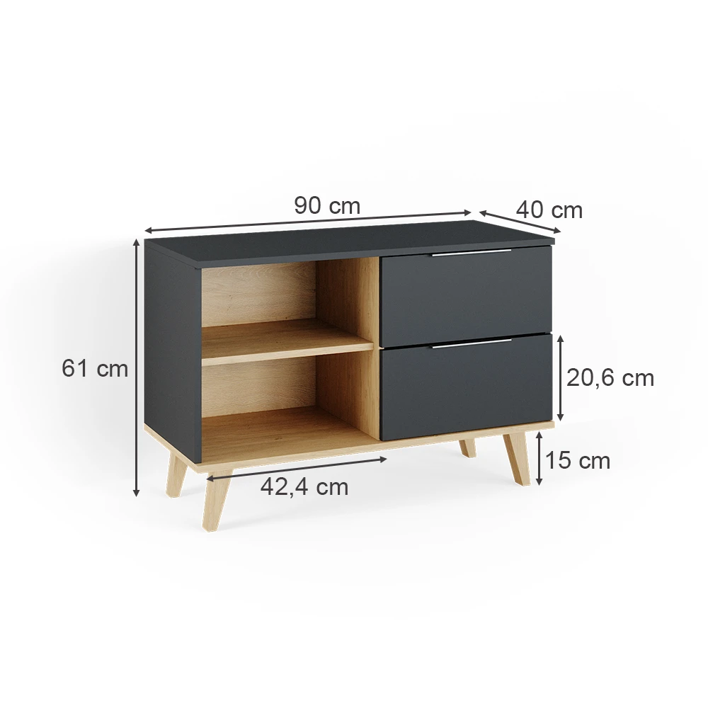 - MAßE: Der TV Schrank hat eine Breite von 90 cm, eine Höhe von 61 cm und eine Tiefe von 40 cm. Alle detaillierten Größen sind auf den Fotos angegeben.