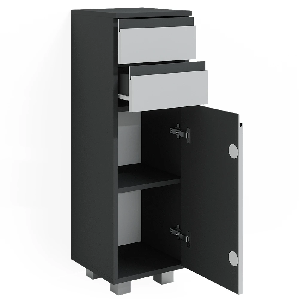 - Badmöbel mit zwei Schubladen, griffloser Front und unauffälligen Füßen. Praktische Funktionen für eine moderne Badezimmerausstattung.
