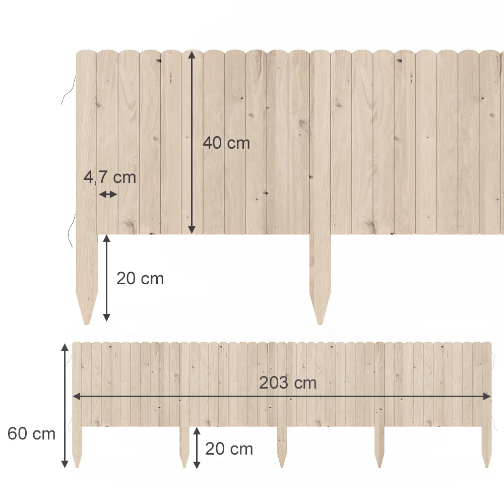 - MAßE: Die Beeteinfassung hat folgende Abmessungen: Breite: 203 cm, Höhe: 40 cm, Tiefe: 1,4 cm. Alle detaillierten Größen sind auf den Fotos angegeben.