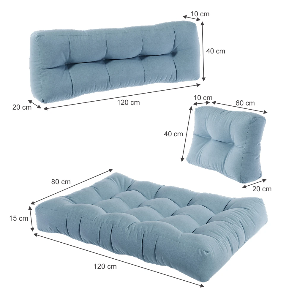 Mit unserem Palettenkissen Set, bestehend aus sieben Teilen, ist die Gestaltung von interessanten und bequemen Palettensofas im Handumdrehen möglich! Unsere hochwertigen Flockenkissen sind outdoor tauglich und garantieren ein bequemes Sitzerlebnis. Dank der fertigen Lösung auf einen Blick muss man sich nicht lange Gedanken über die perfekte Kombination von Kissen machen. Das attraktive Design lässt jedes Lounge-Feeling aufkommen und sorgt für eine gemütliche Atmosphäre im Freien. Die Kissen sind nicht nur weich, sondern auch langlebig und bieten somit eine nachhaltige Lösung für alle, die es sich gerne gemütlich machen – egal ob auf der Terrasse, im Garten oder auf dem Balkon. Erleben Sie selbst das Gefühl von Entspannung und leben Sie Ihren Outdoor-Traum mit unseren Palettenkissen!