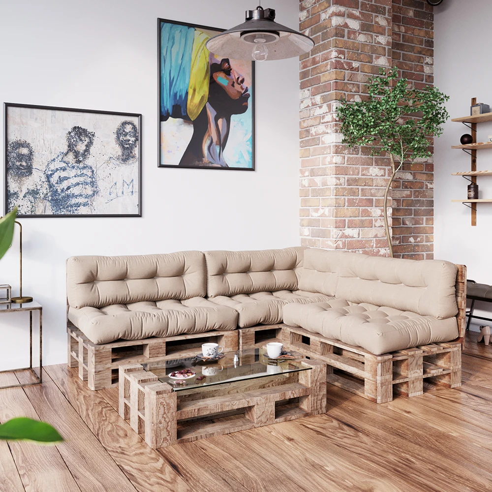 Mit unserem Palettenkissen Set, bestehend aus sieben Teilen, ist die Gestaltung von interessanten und bequemen Palettensofas im Handumdrehen möglich! Unsere hochwertigen Flockenkissen sind outdoor tauglich und garantieren ein bequemes Sitzerlebnis. Dank der fertigen Lösung auf einen Blick muss man sich nicht lange Gedanken über die perfekte Kombination von Kissen machen. Das attraktive Design lässt jedes Lounge-Feeling aufkommen und sorgt für eine gemütliche Atmosphäre im Freien. Die Kissen sind nicht nur weich, sondern auch langlebig und bieten somit eine nachhaltige Lösung für alle, die es sich gerne gemütlich machen – egal ob auf der Terrasse, im Garten oder auf dem Balkon. Erleben Sie selbst das Gefühl von Entspannung und leben Sie Ihren Outdoor-Traum mit unseren Palettenkissen!