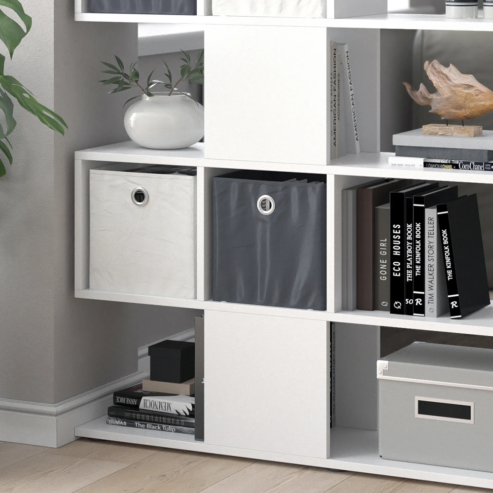 - Der Vicco Raumteiler Hylda ist ein stilvolles Standregal in Weiß mit 4 Faltboxen. Das Treppenregal stehend eignet sich perfekt als offener Raumteiler oder Bücherschrank im Wohnzimmer.