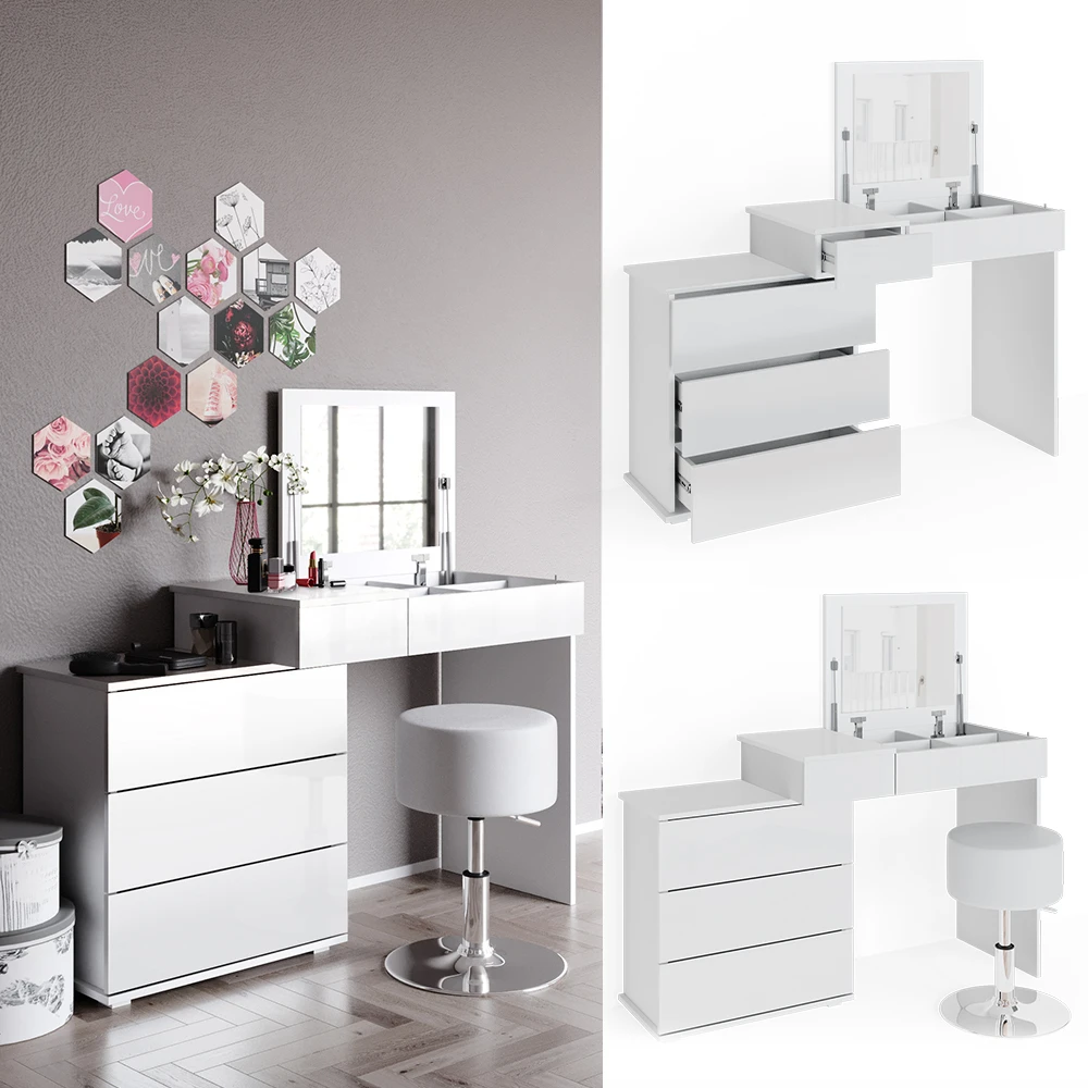 - MATERIAL: Die Schminkkommode besteht aus pflegeleichter Spanplatte 16 mm, mit einer Melaminharzbeschichtung.