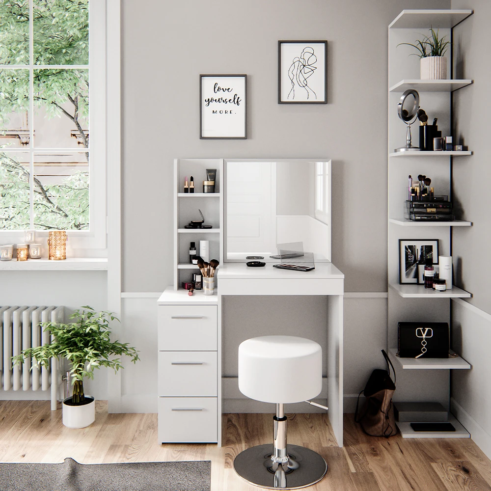 Meryl, der skandinavische Schminktisch, ist der perfekte Ort, um sich für den Tag vorzubereiten. Mit vier Schubladen und drei offenen Fächern hast du genug Platz für all deine Kosmetika, um immer alles griffbereit zu haben. Der elegante rechteckige Spiegel gibt dir eine klare Sicht auf dein Make-up, während du dich an deinem Schminktisch mit dem mitgelieferten Hocker bequem machen kannst. Das Schminktischmodell ist in verschiedenen Ausführungen erhältlich und passt somit perfekt zu deinem persönlichen Stil. Die klaren Linien und das skandinavische Design bringen ein Gefühl von Ruhe und Eleganz in dein Zuhause. Verwandeln Sie Ihr Schlafzimmer in ein stilvolles Refugium mit dem Schminktisch Meryl. Holen Sie sich den glamourösen Look eines Filmstars ins Haus und fühlen Sie sich wie eine Göttin, während Sie sich für den Tag vorbereiten. Bestellen Sie jetzt Ihren Schminktisch und holen Sie sich den Luxus, den Sie verdienen!
