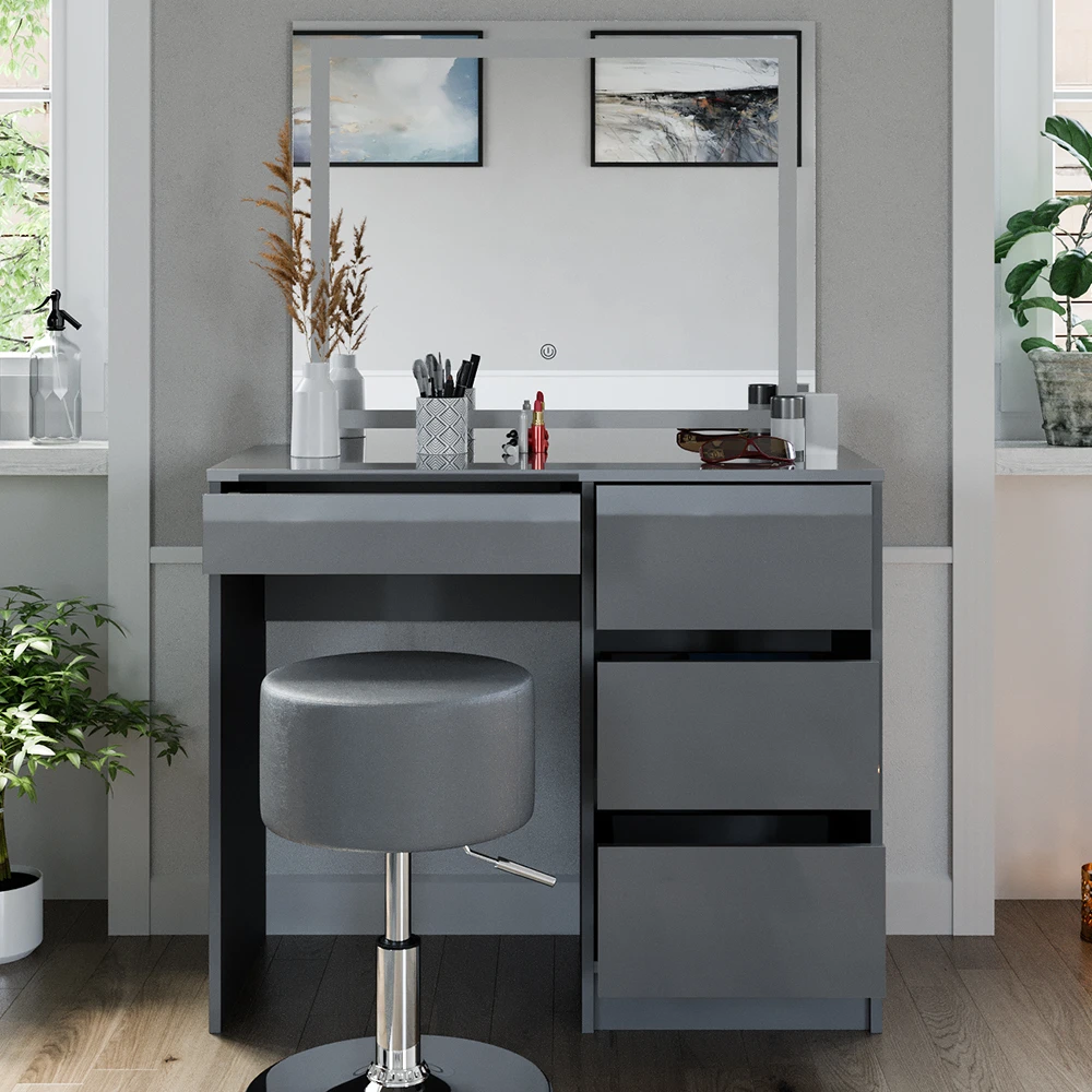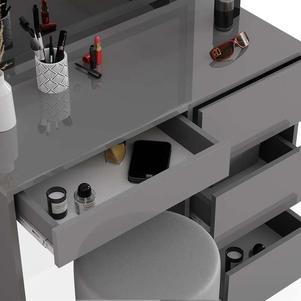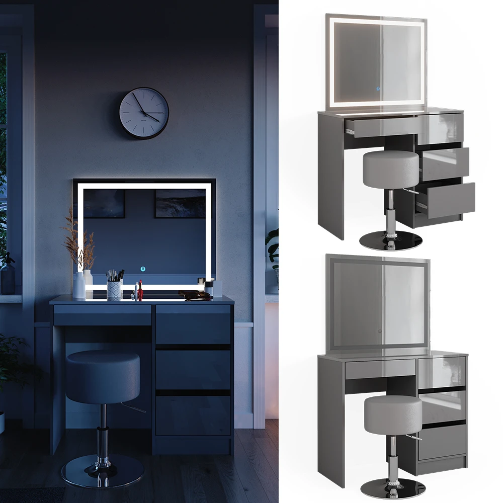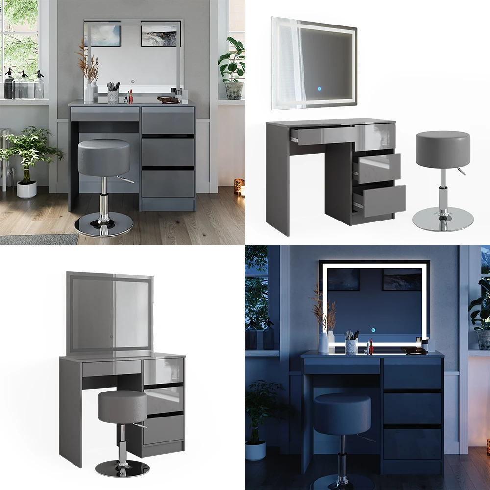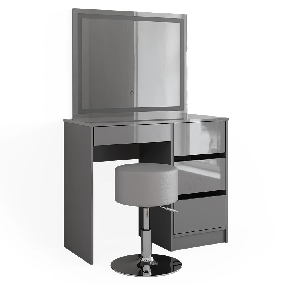- Erfreuen Sie sich an unserem exquisiten Vicco Schminktisch-Set Sherry in edlem Grau Hochglanz: neben der Frisierkommode mit einem LED-Spiegel und einem bequemen Hocker. Ideal für Ihr Make-Up – Styling.