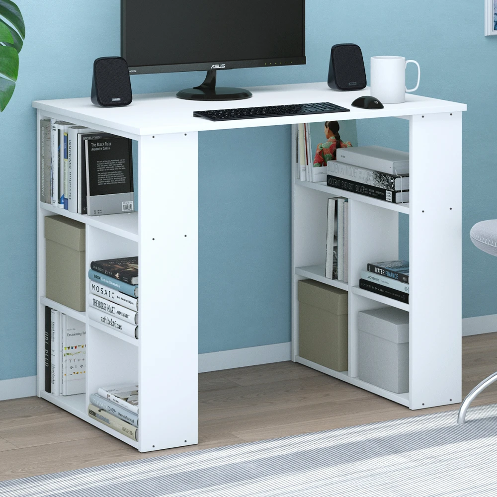 - Der weiße Arbeitstisch für das Büro eignet sich ideal für kleine Räume. Mit offenen Regalen bietet er platzsparend Stauraum für Büromaterialien.