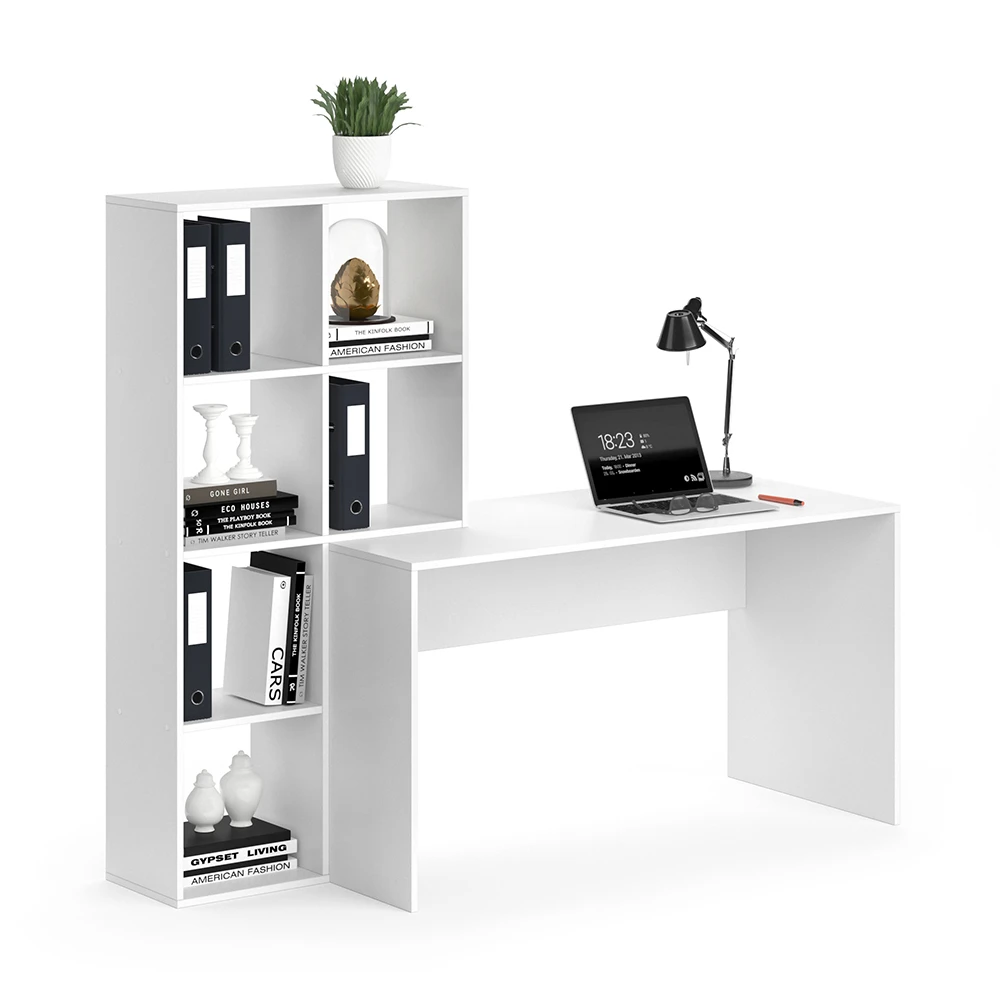- Der Arbeitstisch für das Büro verfügt über ein praktisches Seitenregal mit 6 Fächern, das ideal für kleine Räume ist und dabei platzsparend funktioniert.