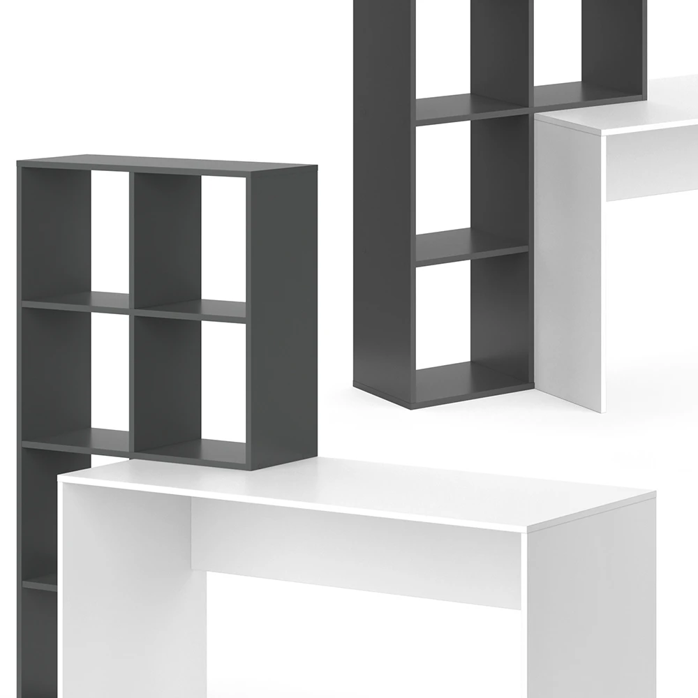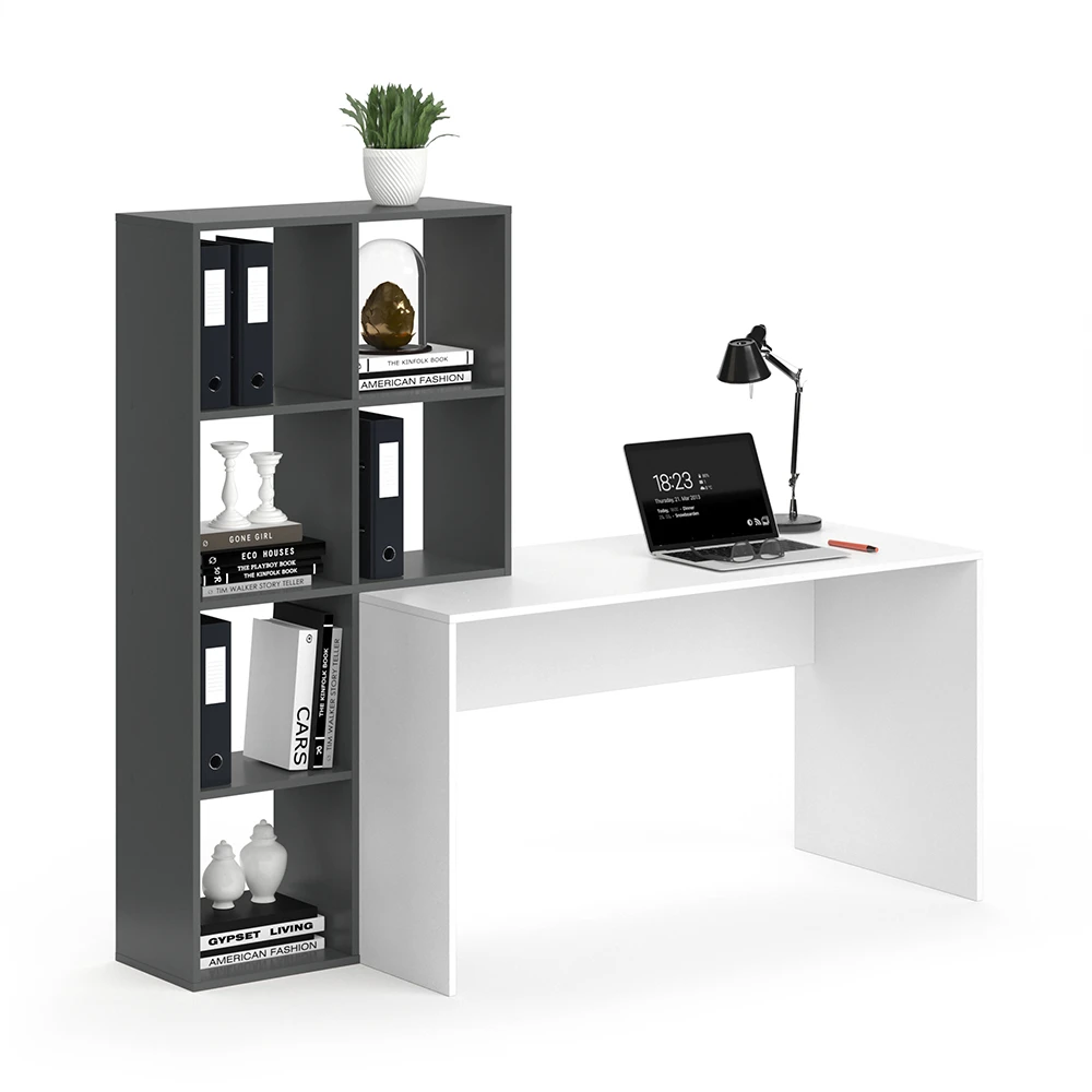 - Der Arbeitstisch für das Büro verfügt über ein praktisches Seitenregal mit 6 Fächern, das ideal für kleine Räume ist und dabei platzsparend funktioniert.