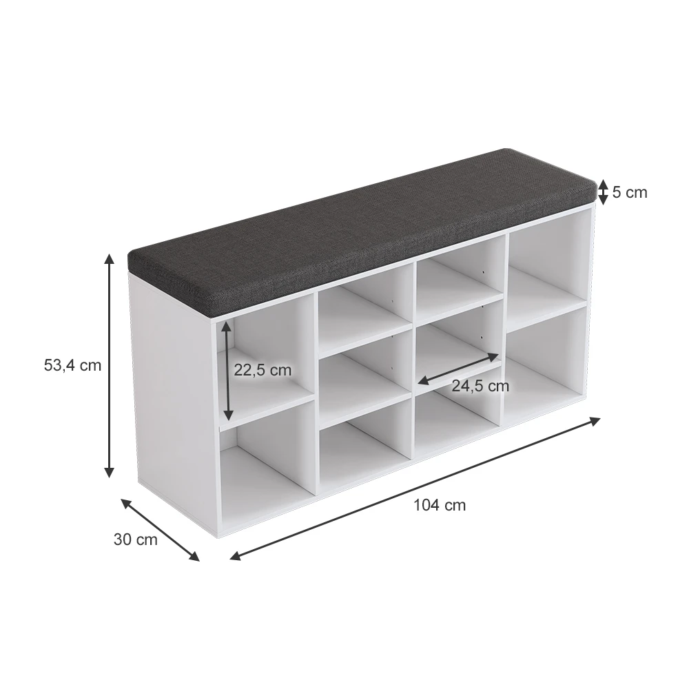 - MAßE: Der Schuhschrank mit Sitzbank hat folgende Abmessungen: Breite: 104 cm, Höhe: 53,5 cm, Tiefe: 30 cm. Alle detaillierten Größen sind auf den Fotos angegeben.