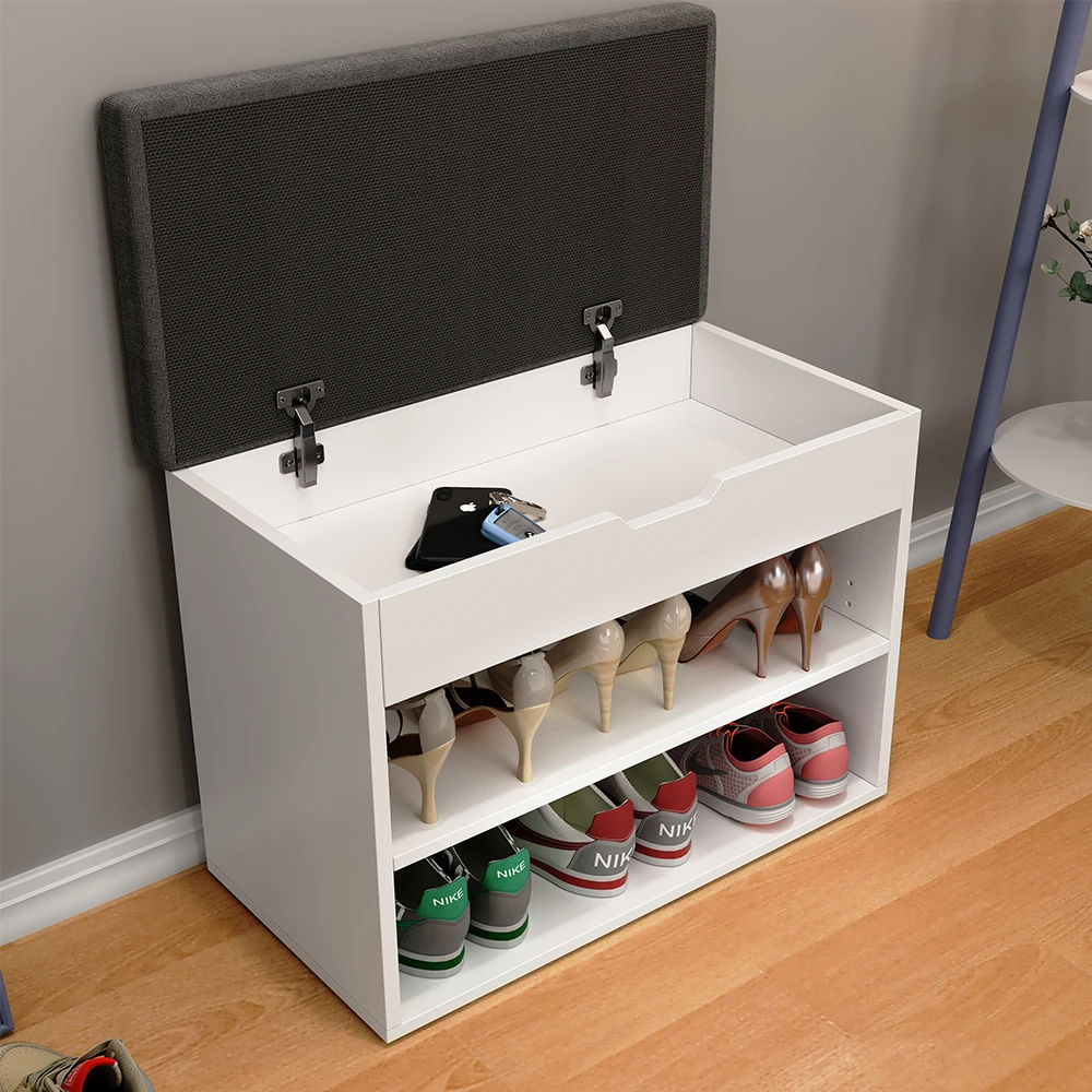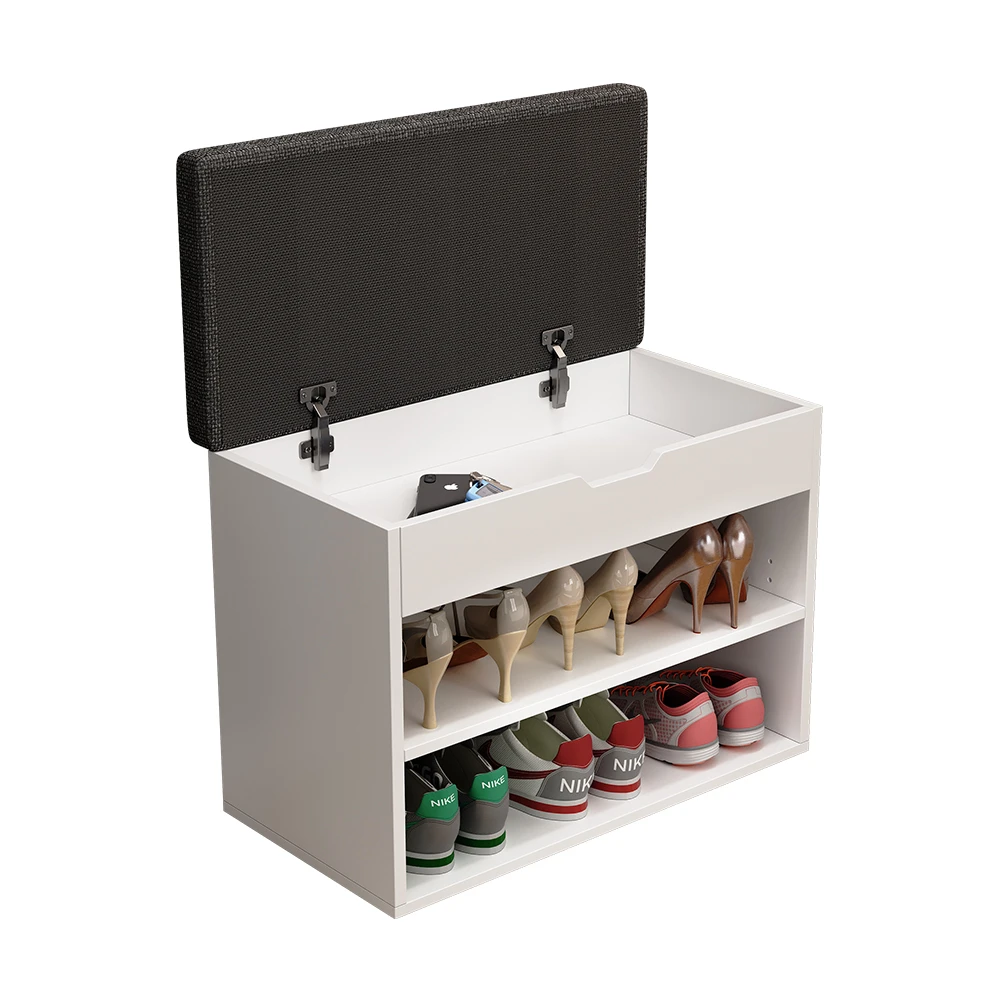 - Mit ihrer schlichten Optik und modernem Design vereint das Schuhregal Ästhetik mit Funktionalität und dient gleichzeitig als bequeme Sitzgelegenheit mit Auflage.