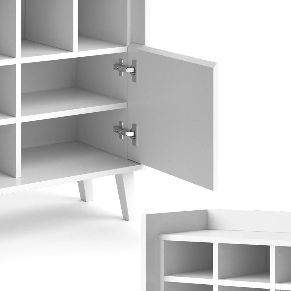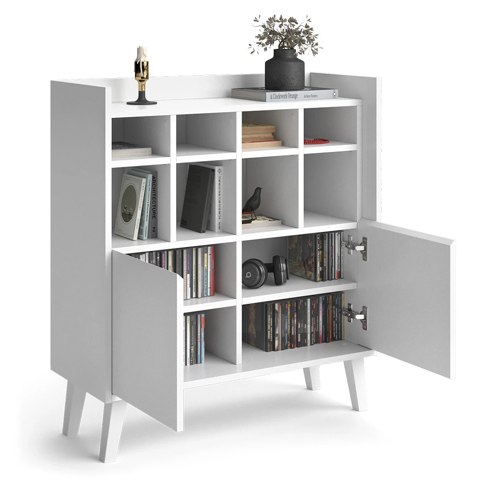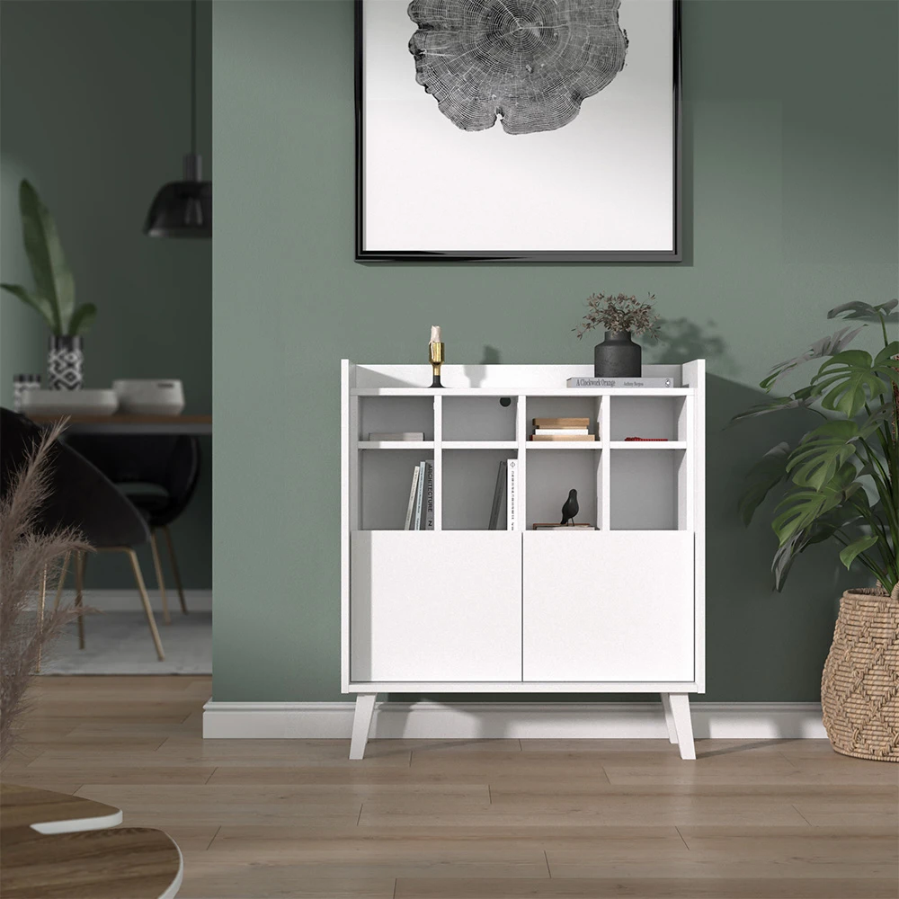 Das Sideboard Cube vereint Stil und Funktionalität auf perfekte Weise. Der skandinavische Look dieses Möbelstücks lässt jedes Wohnzimmer gemütlicher wirken. Die Kommode mit Türen bietet eine Menge Stauraum für alle Gegenstände, die man gerne verstauen möchte. Mit insgesamt 8 offenen Regalen und 4 geschlossenen Fächern bietet das Sideboard Cube ausreichend Platz für alle Bedürfnisse. Ob als Kommodenschrank oder als Wohnzimmerschrank – das Modell Cube passt gut zu anderen Möbelstücken. Es ist der perfekte Ort, um Sammlerstücke, Bücher oder Erinnerungen aufzubewahren. Wenn Sie auf der Suche nach einem Möbelstück sind, das Ihre Wohnzimmereinrichtung vervollständigt, ist das Sideboard Cube definitiv das richtige für Sie!