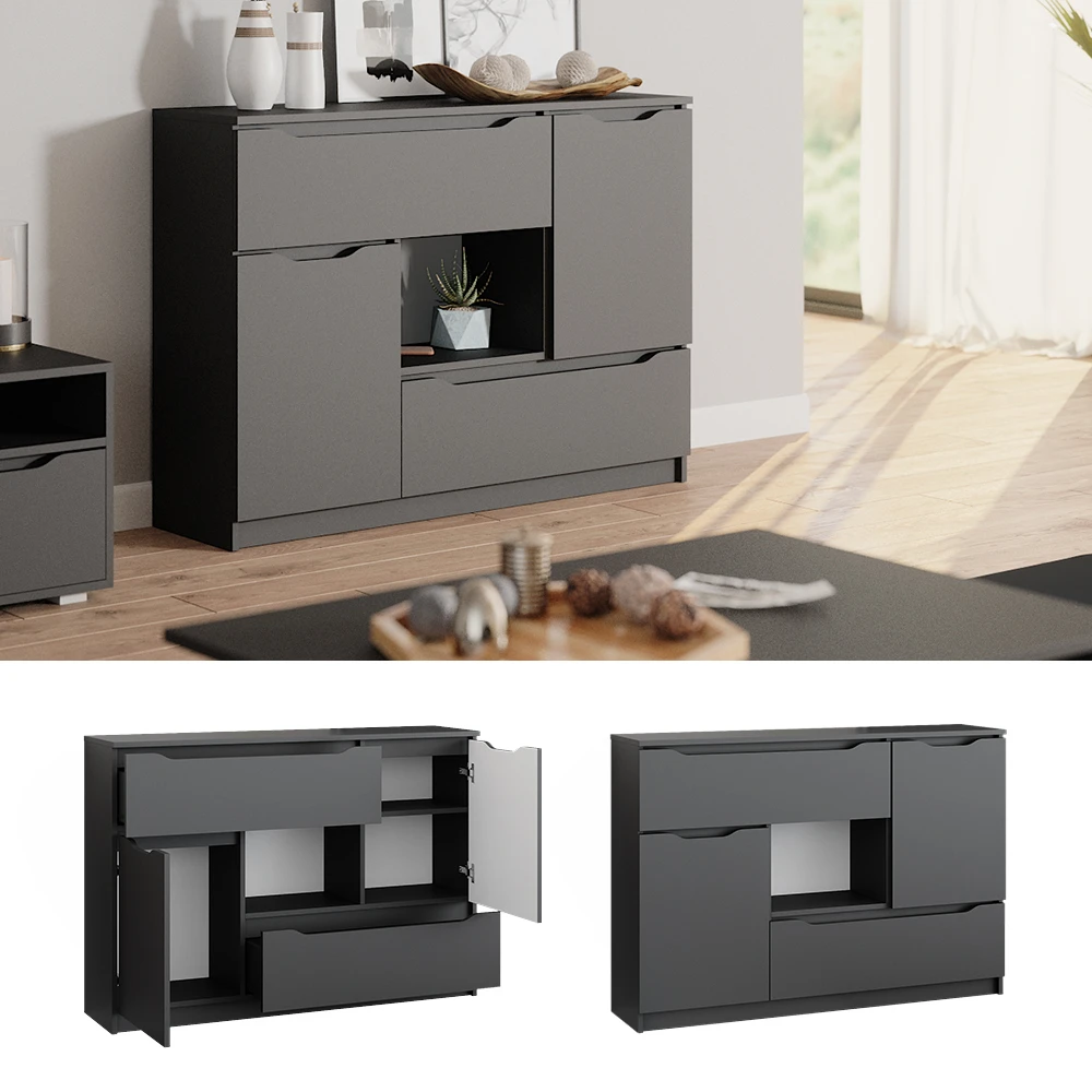 Das Sideboard Ruben ist das perfekte Möbelstück für alle, die Wert auf ein minimalistisches Design und viel Stauraum legen. Das Modell ist Teil der Ruben-Serie und bietet zahlreiche Optionen für jeden Raum. Ob als Kommode mit Schubladen, Kommodenschrank oder Anrichte – das Sideboard ist ein wahrer Allrounder für Wohn- und Schlafzimmer. Die Schubladen sind geräumig und bieten ausreichend Platz für Kleidung, Wäsche, Unterlagen und vieles mehr. Dank der klaren Linienführung fügt sich das Sideboard nahtlos in jedes Raumkonzept ein und verleiht dem Ambiente einen edlen Touch. Mit dem Sideboard Ruben bringen Sie nicht nur Ordnung in Ihr Zuhause, sondern auch zeitlose Eleganz.