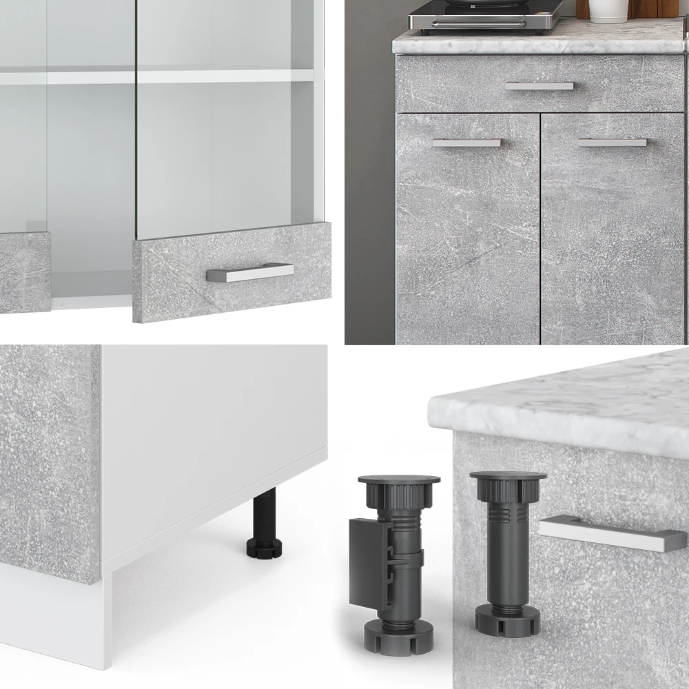 - Die Küchenzeile Single ist modular aufstellbar und kann je nach Bedarf erweitert werden. Dank höhenverstellbarer Füße ist ein individuelles Anpassen möglich.