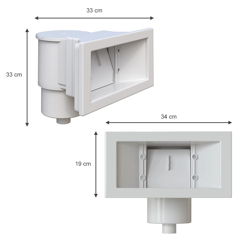- MAßE: Der Einbauskimmer hat eine Breite von 34 cm, eine Höhe von 33 cm und eine Tiefe von 33 cm. Alle detaillierten Größen sind auf den Fotos angegeben.
