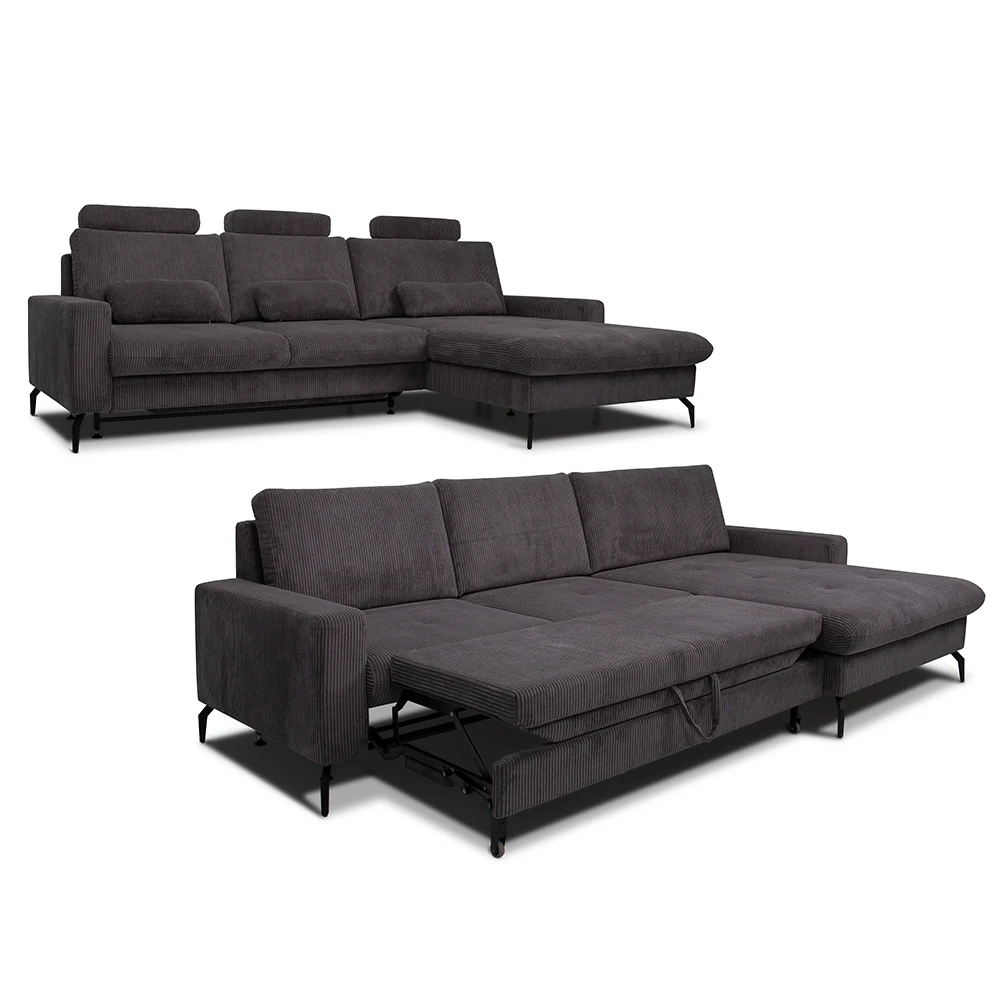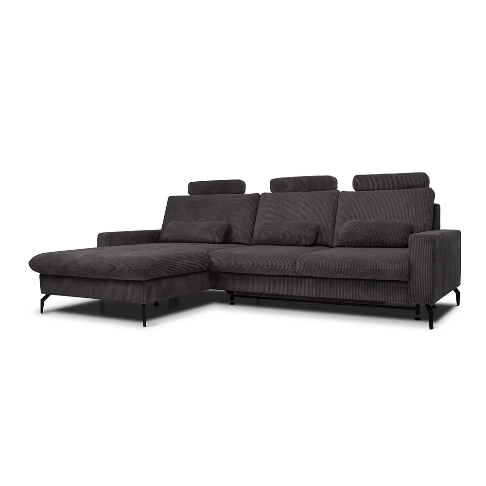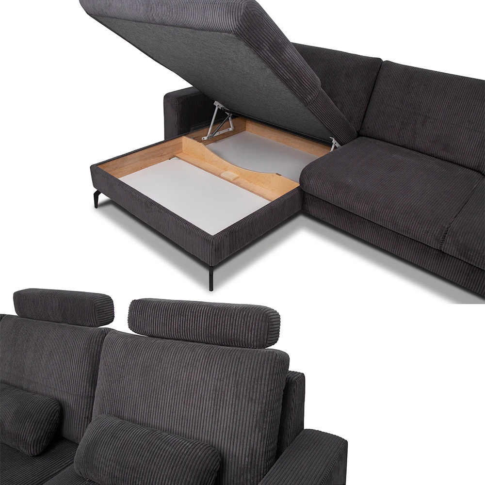 Das Sofa mit Schlaffunktion und Bettkasten bietet flexiblen Komfort und praktischen Stauraum – ideal für Gäste und zusätzliche Decken oder Kissen. Beidseitig montierbar lässt sich das Sofa links oder rechts platzieren – je nach Raumaufteilung und persönlicher Vorliebe. Die 3 mitgelieferten Kissen sorgen für zusätzlichen Komfort bei gemütlicher Atmosphäre. Die höhenverstellbaren Kopfstützen ermöglichen eine individuelle Anpassung für optimalen Komfort samt ergonomischer Unterstützung.