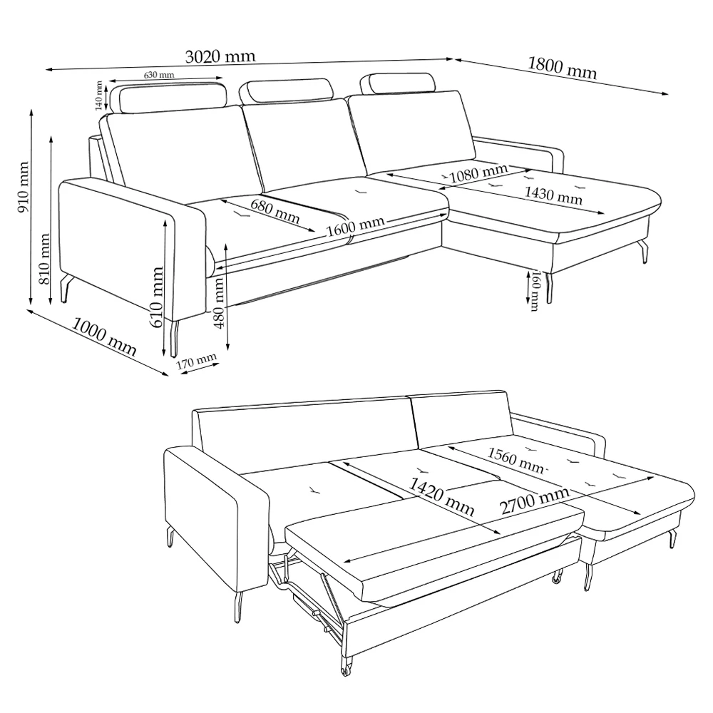 - MAßE: Das Ecksofa mit Schlaffunktion hat folgende Abmessungen: Breite: 302 cm, Höhe: 105 cm, Tiefe: 180 cm. Alle detaillierten Größen sind auf den Fotos angegeben.