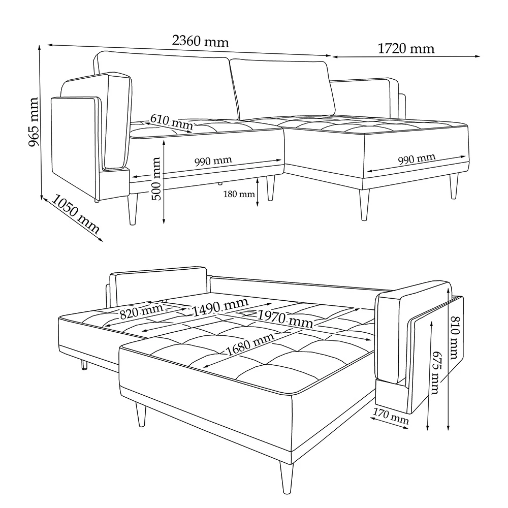 - MAßE: Das Ecksofa mit Schlaffunktion hat eine Breite von 236 cm, eine Höhe von 97 cm und eine Tiefe von 172 cm. Alle detaillierten Größen sind auf den Fotos angegeben.