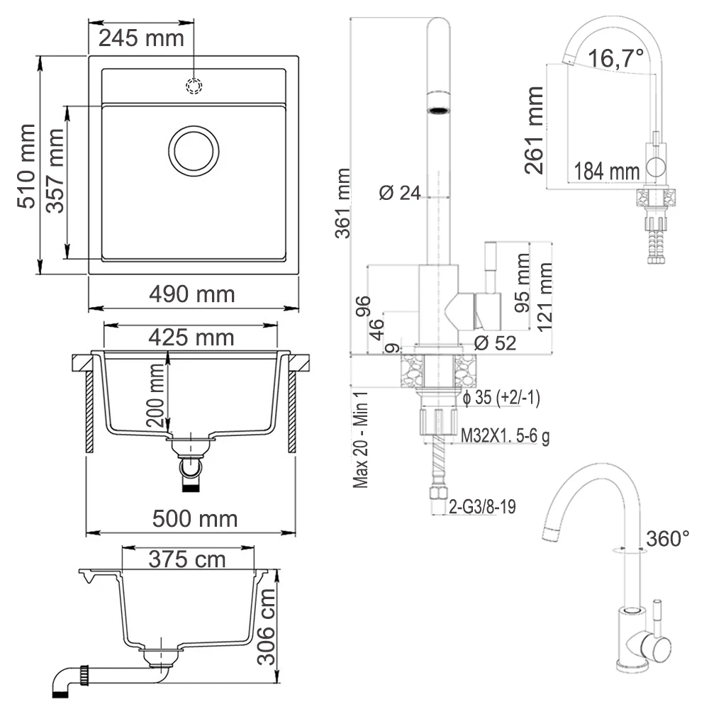 • 1 Spülbecken mit Armatur inkl. Montagematerial und -anleitung