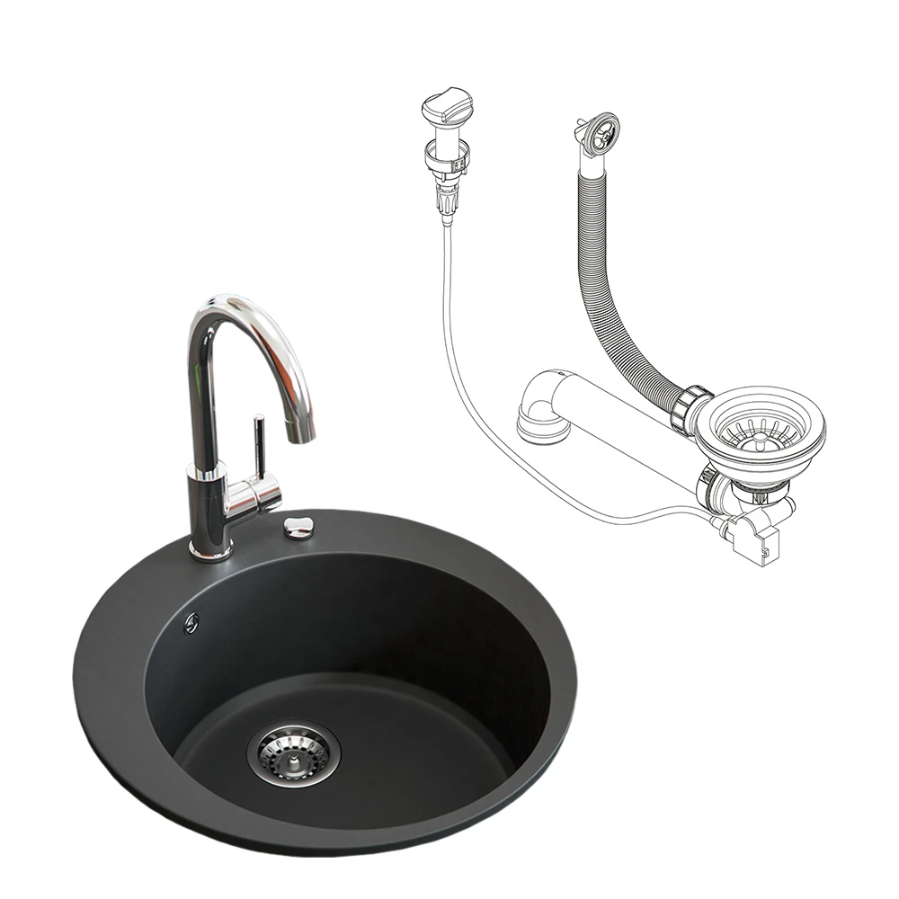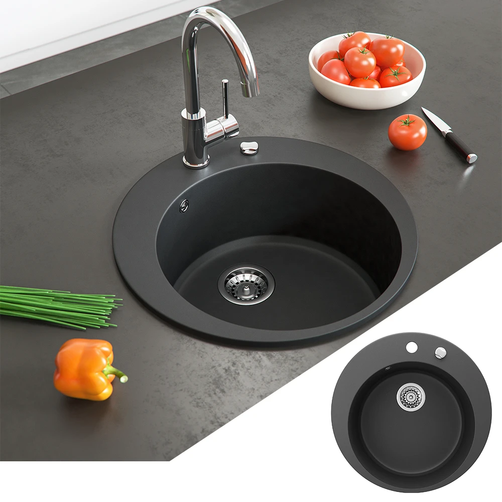 - Die runde Spüle aus Granit ist beständig gegen Chemikalien und kann Temperaturen von 15°C bis 95°C standhalten. Ideal für den täglichen Gebrauch in der Küche.