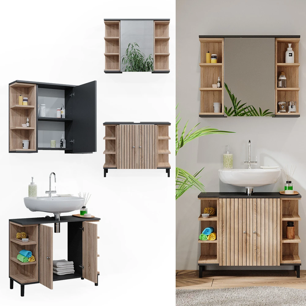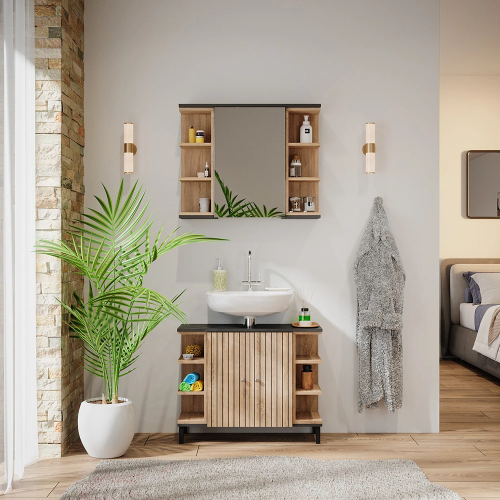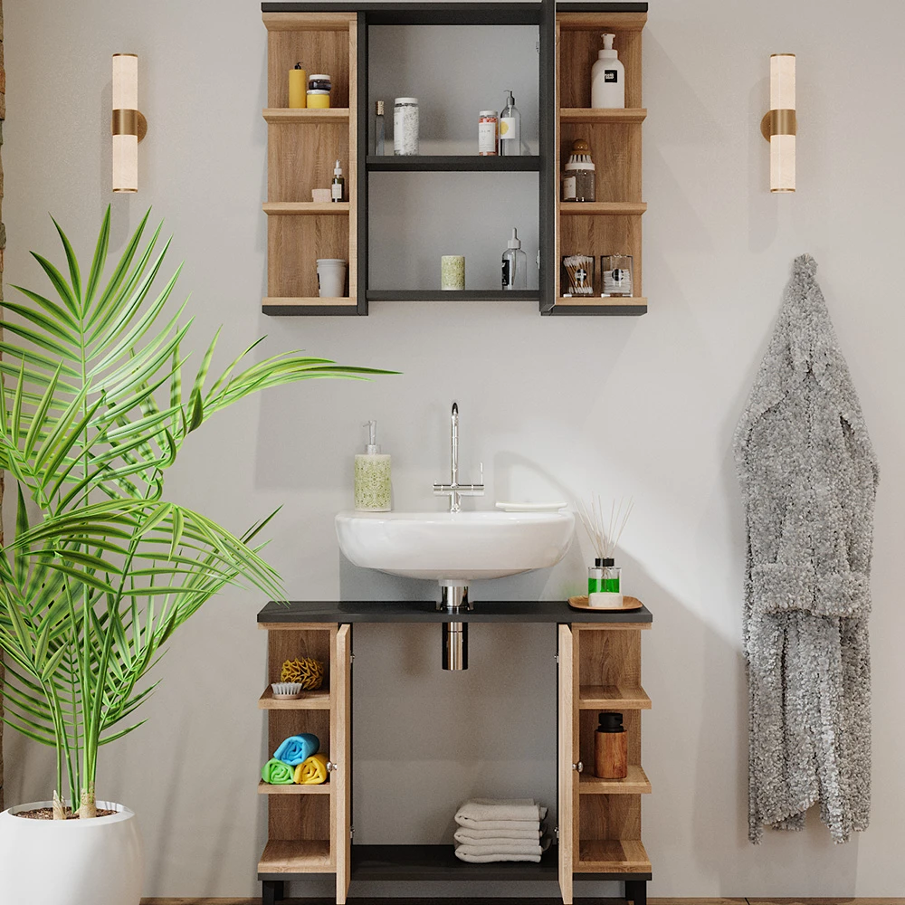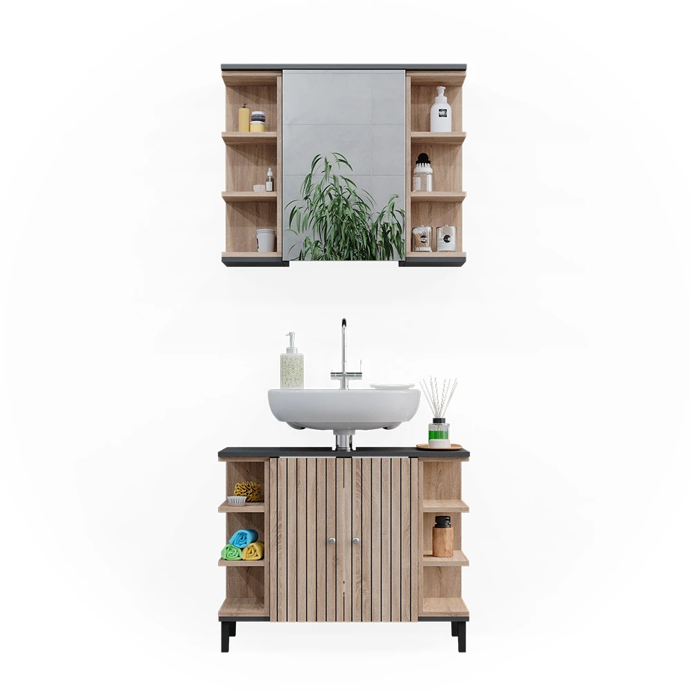 - MATERIAL: Das Set mit dem Spiegelschrank besteht aus pflegeleichter Spanplatte 16 mm, mit einer Melaminharzbeschichtung.