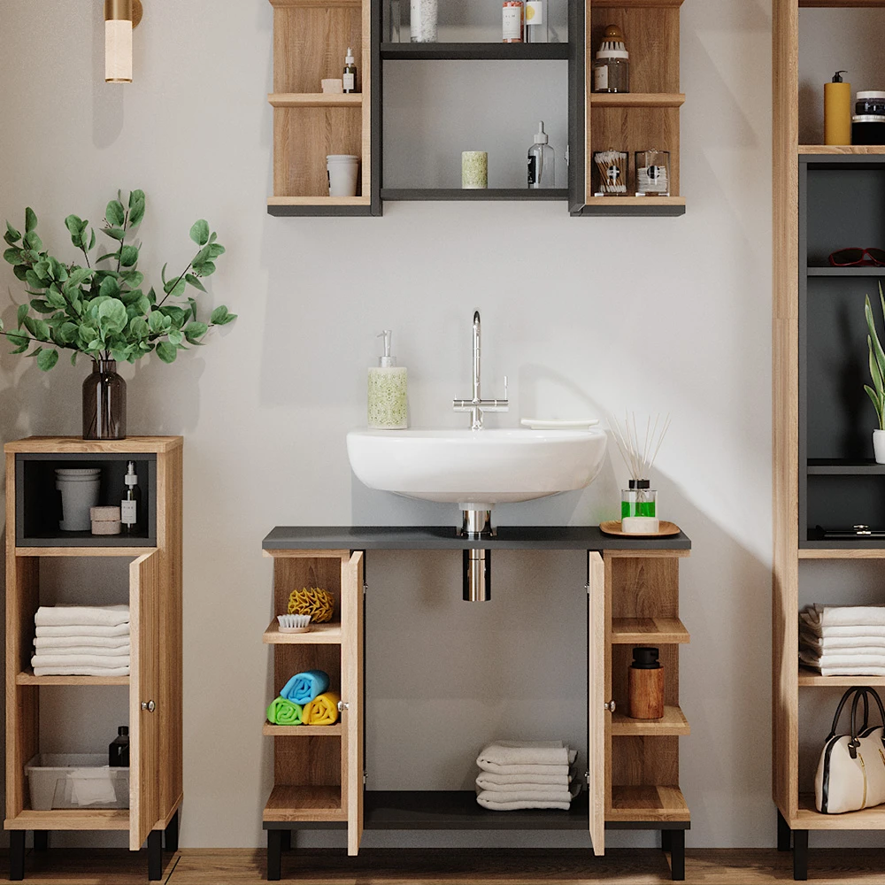 - Erleben Sie das Vicco Badmöbel-Set Aquis in Sonoma-Anthrazit – Ihre moderne Badezimmerlösung. Mit Waschtischunterschrank, Midischrank, Hochschrank und Spiegelschrank schaffen Sie stilvollen Stauraum.